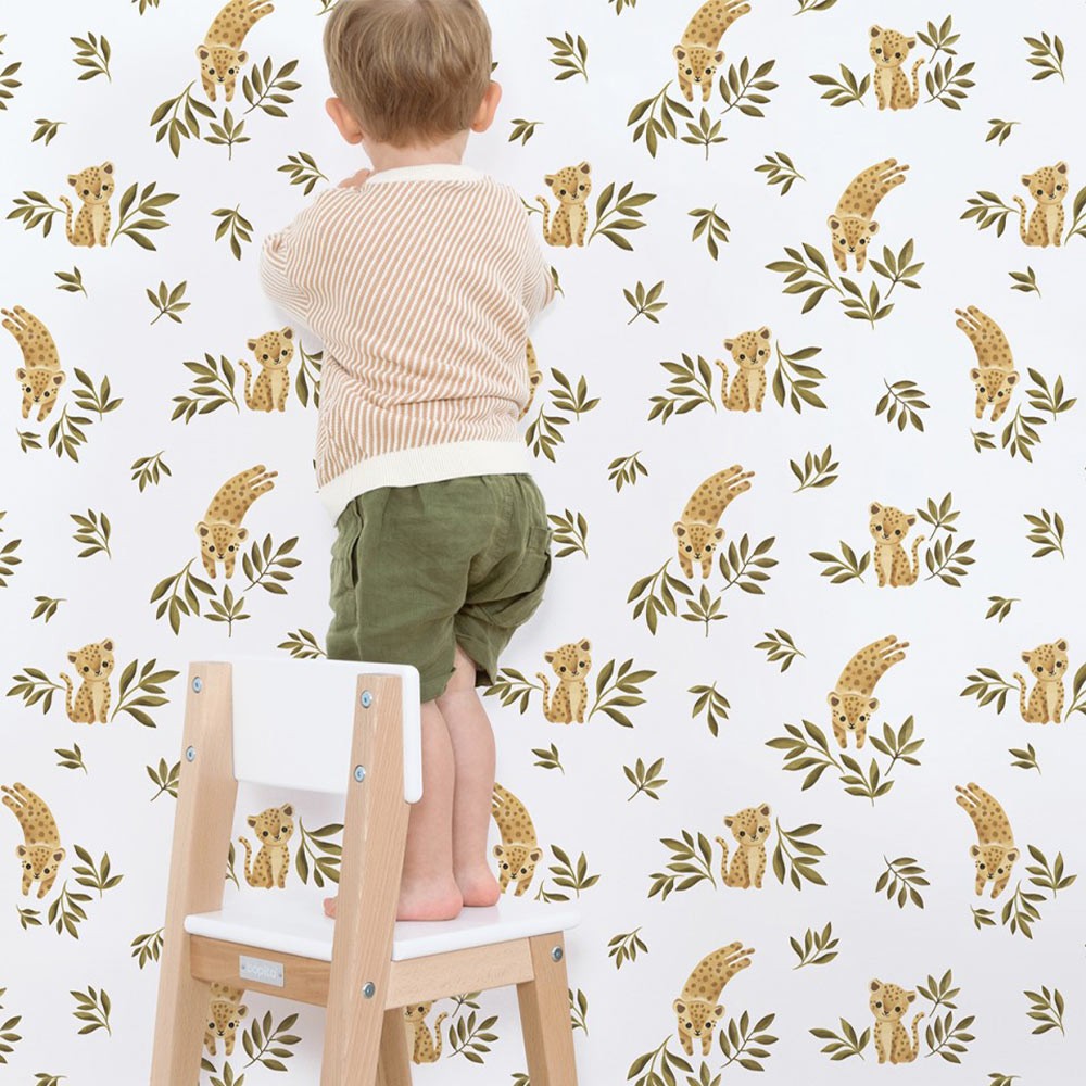 Discover this beautiful wallpaper from the Felidae collection in non-woven paper with small leopards as a motif to personalize your child's room. Nonwoven is a material that has revolutionized the world of wallpaper, easy to install, no need for a wallpaper table, the glue is applied directly to the wall and it requires no special preparation and is easily cut with a cutter.