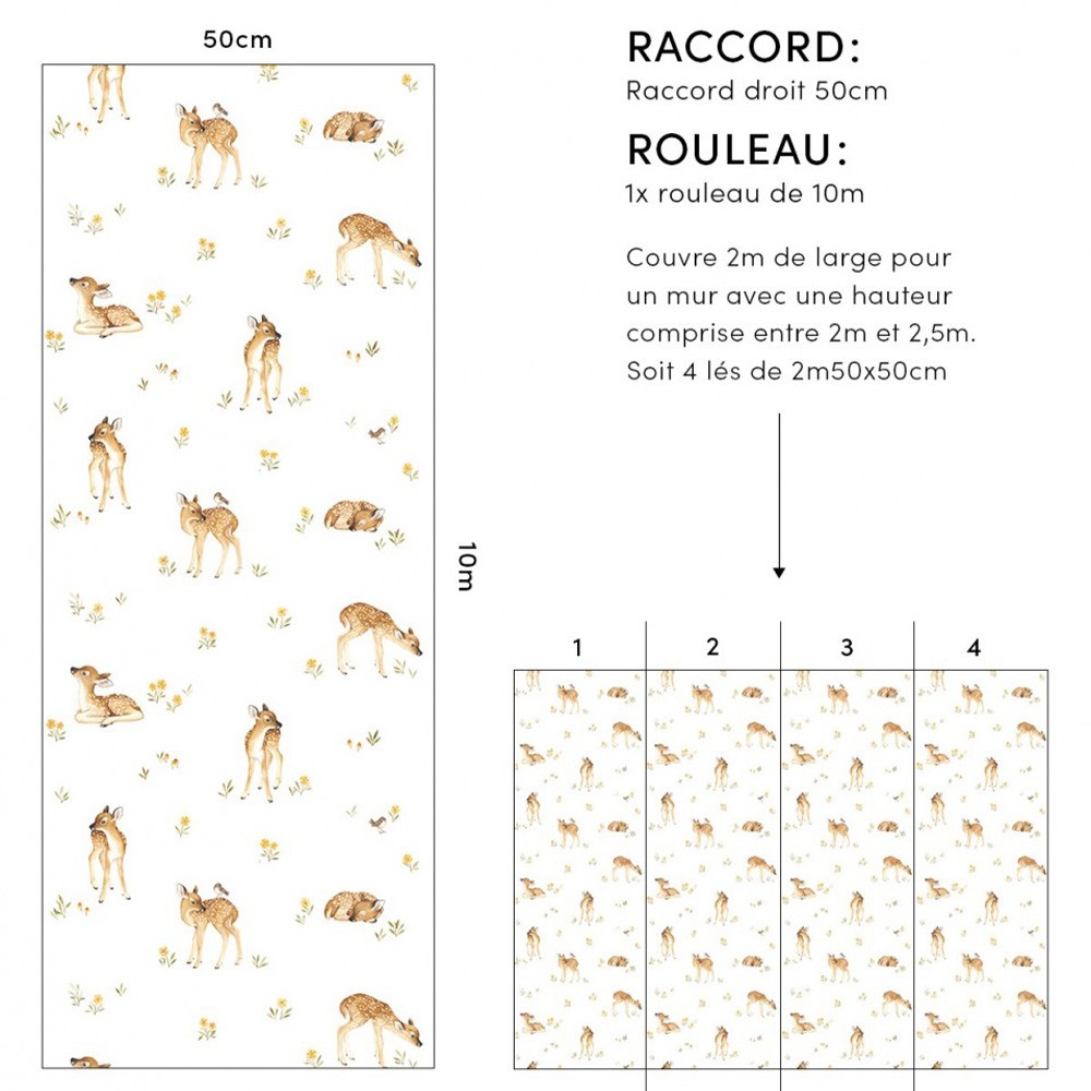 Discover this beautiful wallpaper from the Oh Deer collection in non-woven paper with fawns as a motif to personalize your child's room. Nonwoven is a material that has revolutionized the world of wallpaper, easy to install, no need for a wallpaper table, the glue is applied directly to the wall and it requires no special preparation and is easily cut with a cutter.