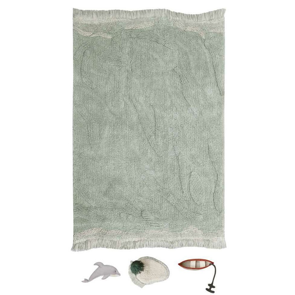 La alfombra Waves, de color salvia, tiene una superficie irregular y está rematada en los bordes con flecos cortos de colores mezclados, inspirados en las olas de la playa. La alfombra viene con un conjunto de accesorios artesanales para jugar: una pequeña isla con una palmera, un barco con anclas de cuerdas trenzadas y un delfín de algodón orgánico.