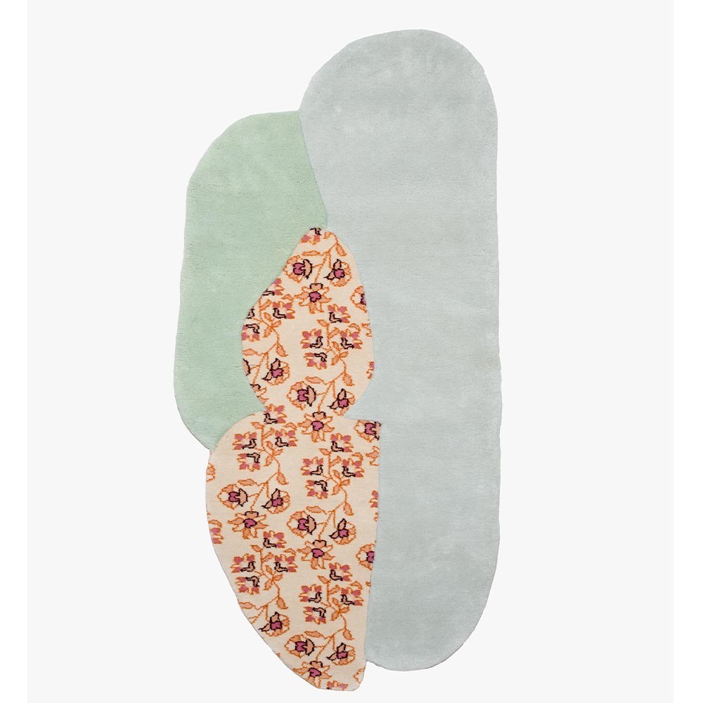 La alfombra FLORA presenta una composición equilibrada de verdes apagados y pasteles suaves, contrastados por delicados motivos florales en tonos cálidos. Su forma asimétrica y escultural refleja las suaves curvas de las hojas y los pétalos, creando una pieza visualmente dinámica que es a la vez natural y artística.