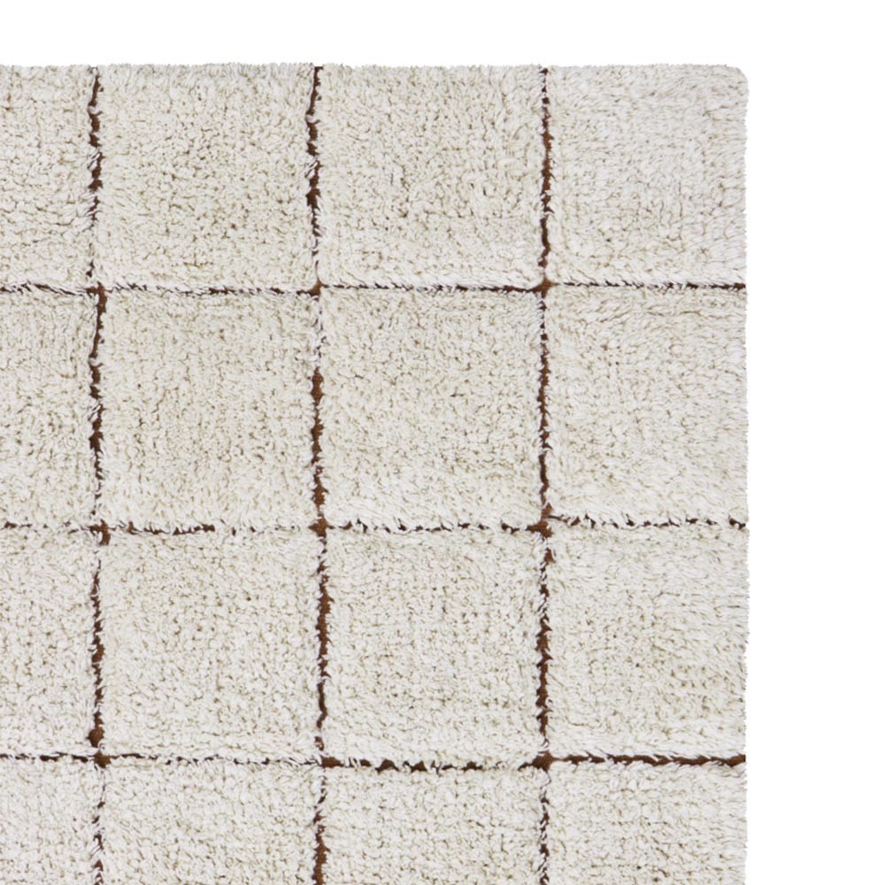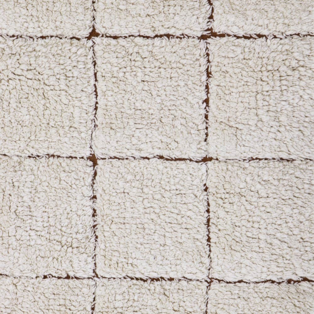 Descubra la alfombra lavable Mosaic de Lorena Canals. Esta alfombra presenta un motivo de mosaico liso en color natural sobre una base de tela marrón caramelo dejada parcialmente al descubierto para imitar las juntas.