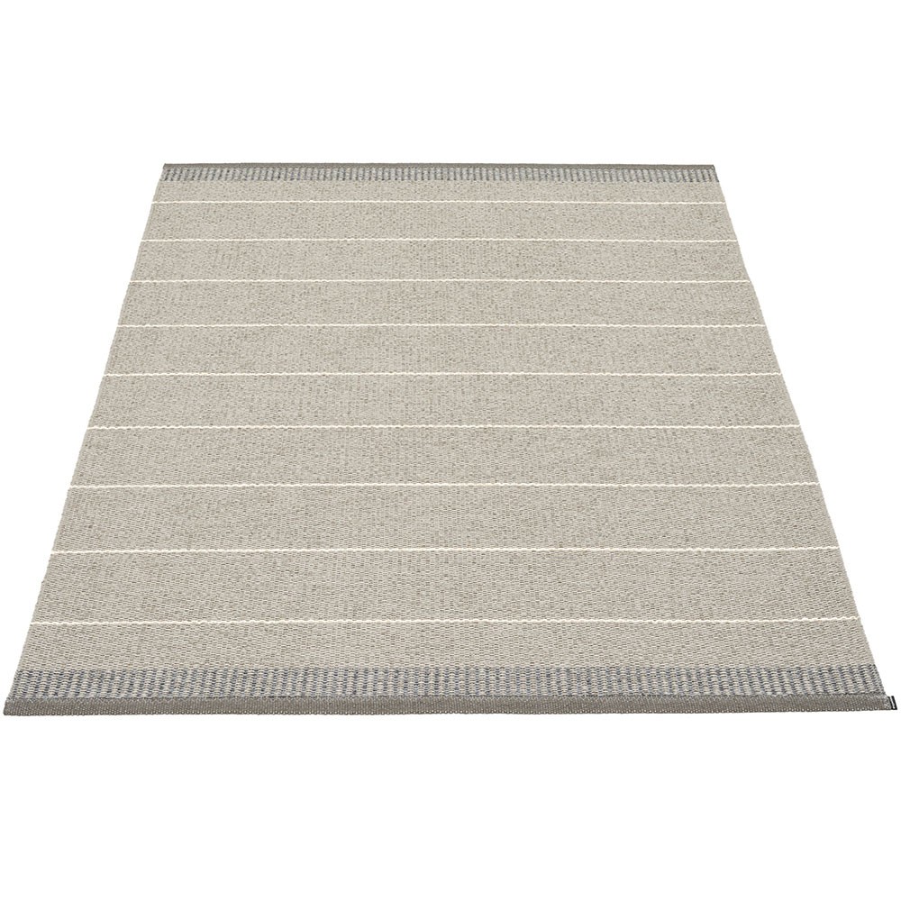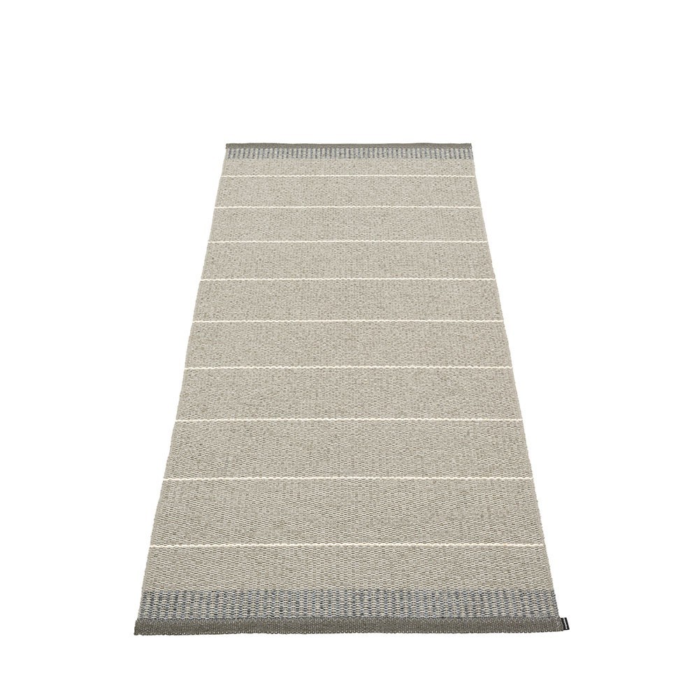 Producido en Dalarna, Suecia. Tejido en telar tradicional mediante lanzaderas de madera. Una alfombra de PVC muy práctica y de fácil cuidado fabricada en Suecia. Cintas plásticas prensadas para mayor resistencia y durabilidad del producto con el logo Pappelina presionado en ambos bordes.