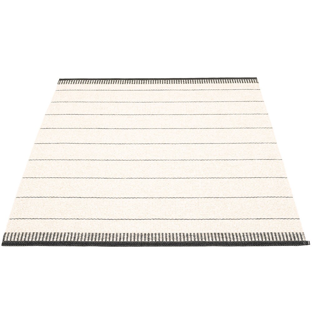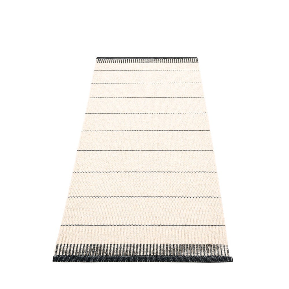 Producido en Dalarna, Suecia. Tejido en telar tradicional mediante lanzaderas de madera. Una alfombra de PVC muy práctica y de fácil cuidado fabricada en Suecia. Cintas plásticas prensadas para mayor resistencia y durabilidad del producto con el logo Pappelina presionado en ambos bordes.