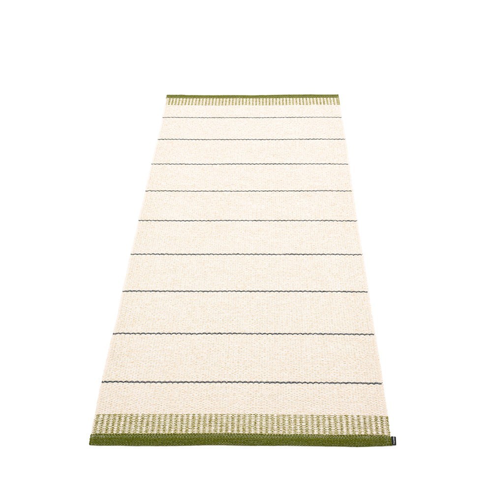 Producido en Dalarna, Suecia. Tejido en telar tradicional mediante lanzaderas de madera. Una alfombra de PVC muy práctica y de fácil cuidado fabricada en Suecia. Cintas plásticas prensadas para mayor resistencia y durabilidad del producto con el logo Pappelina presionado en ambos bordes.