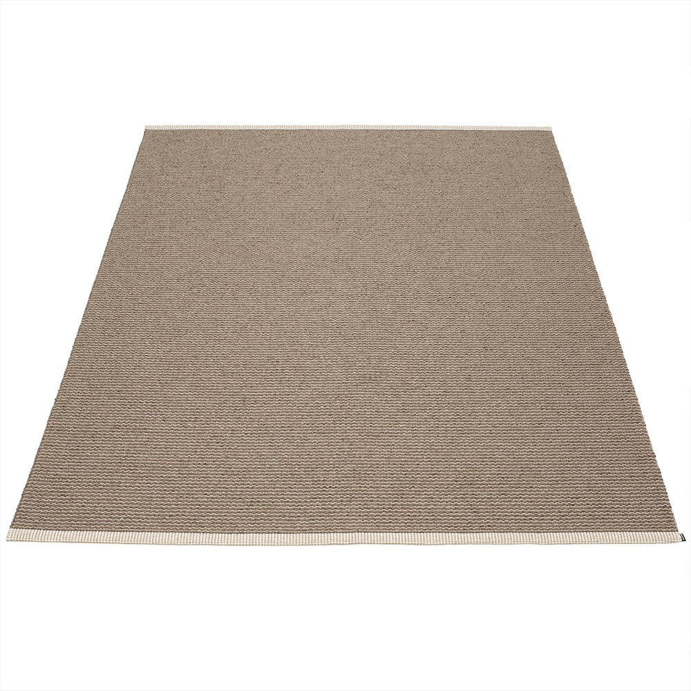 Producido en Dalarna, Suecia. Tejido en telar tradicional mediante lanzaderas de madera. Una alfombra de PVC muy práctica y de fácil cuidado fabricada en Suecia. Cintas plásticas prensadas para mayor resistencia y durabilidad del producto con el logo Pappelina presionado en ambos bordes.