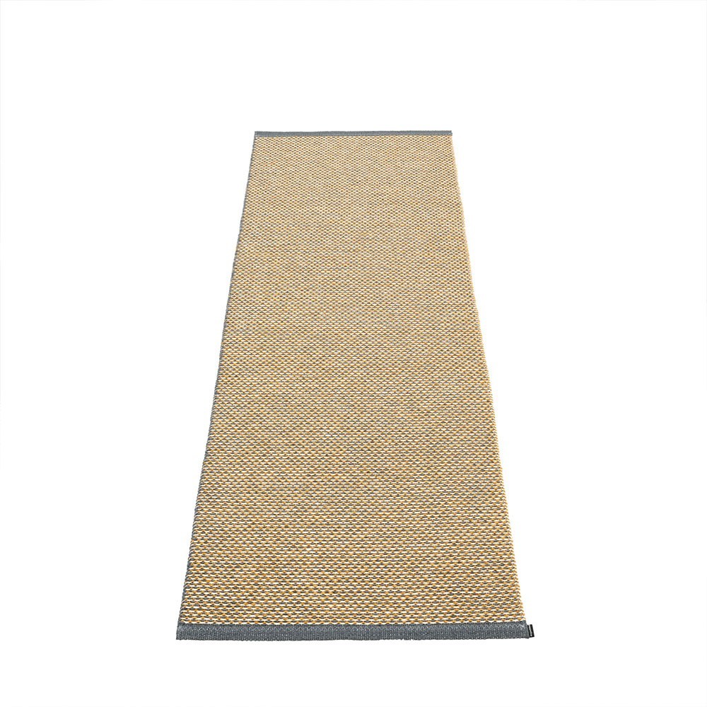 Producido en Dalarna, Suecia. Tejido en telar tradicional mediante lanzaderas de madera. Una alfombra de PVC muy práctica y de fácil cuidado fabricada en Suecia. Cintas plásticas prensadas para mayor resistencia y durabilidad del producto con el logo Pappelina presionado en ambos bordes.