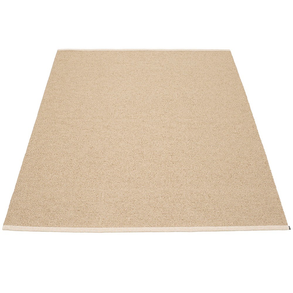 Producido en Dalarna, Suecia. Tejido en telar tradicional mediante lanzaderas de madera. Una alfombra de PVC muy práctica y de fácil cuidado fabricada en Suecia. Cintas plásticas prensadas para mayor resistencia y durabilidad del producto con el logo Pappelina presionado en ambos bordes.