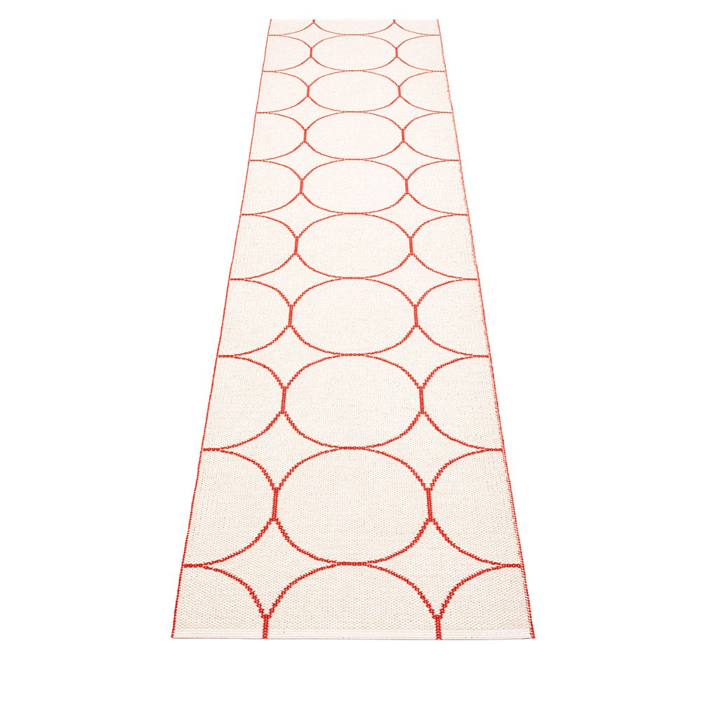 Producido en Dalarna, Suecia. Tejido en telar tradicional mediante lanzaderas de madera. Una alfombra de PVC muy práctica y de fácil cuidado fabricada en Suecia. Cintas plásticas prensadas para mayor resistencia y durabilidad del producto con el logo Pappelina presionado en ambos bordes.