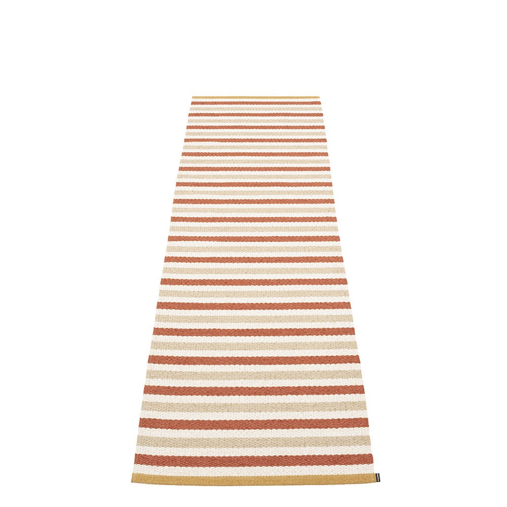 Fabricada enante, la alfombrilla TEO está hecha de plástico para uso en interiores y exteriores. Los bordes tienenun dobladillo con un logotipo cosido en un extremo. La alfombra está tejida con tiras de plástico sin ftalatos por Gislaved Folie AB en un telar tradicional. Está disponible en varios colores y tamaños.