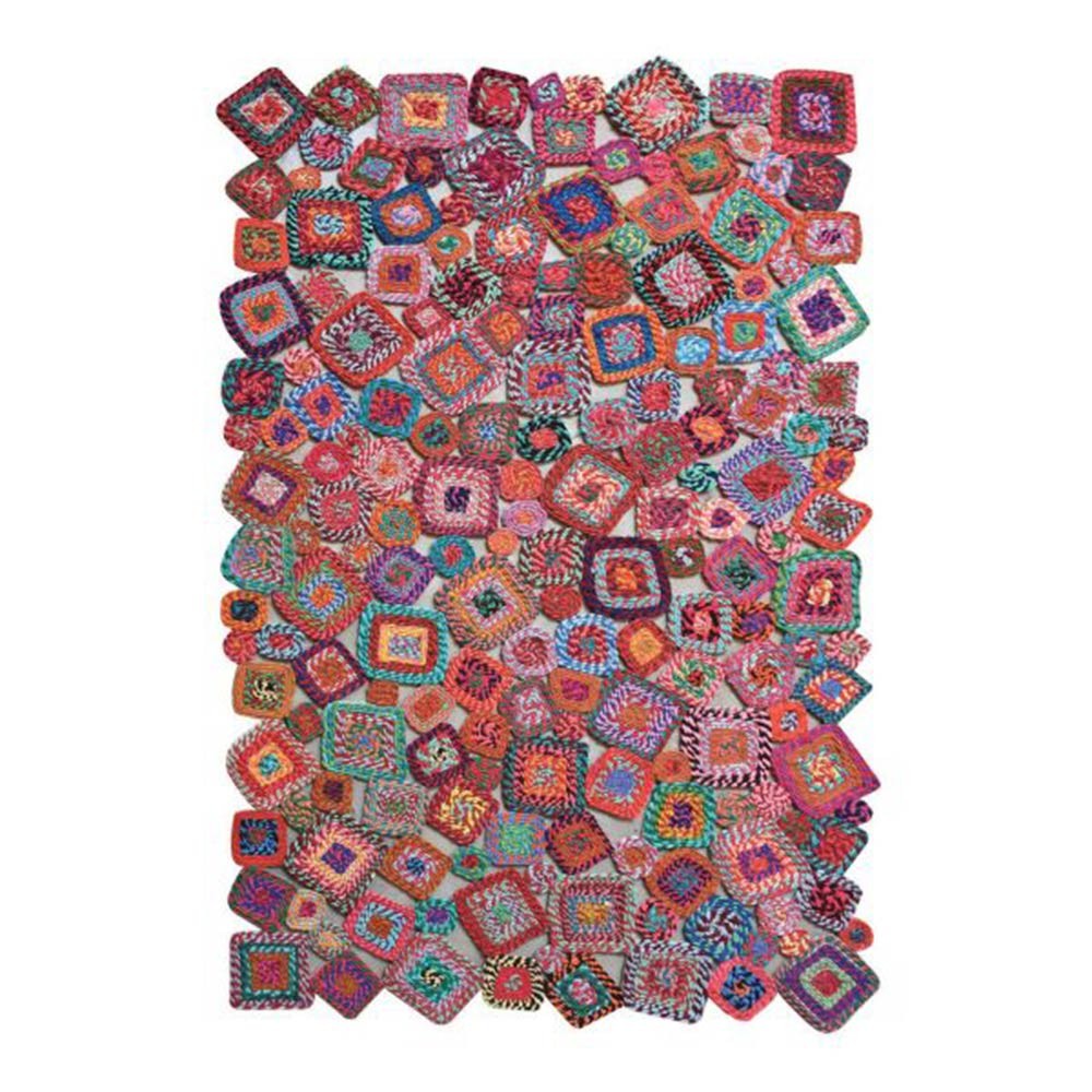 Tejido a mano con técnicas tradicionales. Se fabrica exclusivamente a partir de fibras recicladas. Cada pieza es única y se compone para lograr un resultado a la vez colorido y moderno.