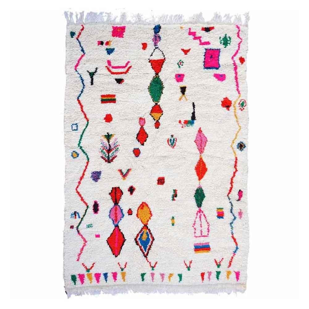 Esta alfombra llamada Azilal toma su nombre de la región de Azilal en las montañas del Atlas en Marruecos donde se fabricó. Cada pieza está hecha 100% a mano en un telar tradicional. Se necesitan más de dos meses de tejido para hacer una alfombra de tamaño mediano.