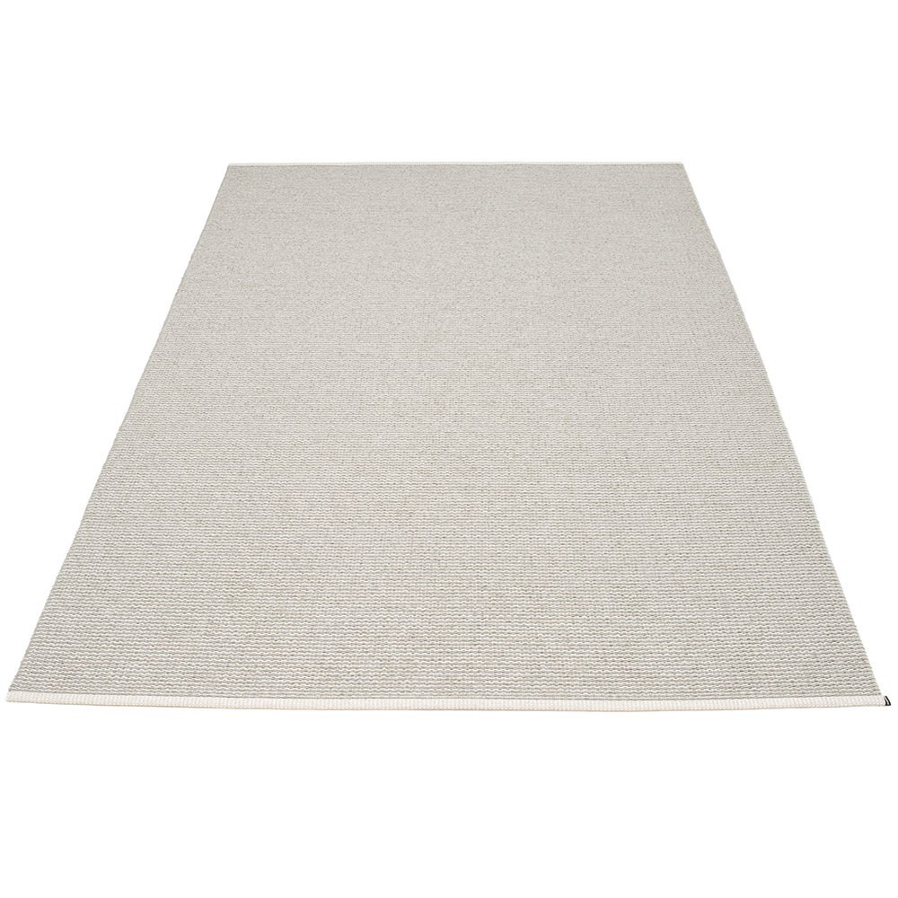 Producido en Dalarna, Suecia. Tejido en telar tradicional mediante lanzaderas de madera. Una alfombra de PVC muy práctica y de fácil cuidado fabricada en Suecia. Cintas plásticas prensadas para mayor resistencia y durabilidad del producto con el logo Pappelina presionado en ambos bordes.