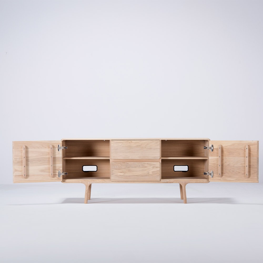 Déjate seducir por la belleza del buffet Fawn. ¡Con sus superficies suaves y líneas fluidas, es un verdadero placer para la vista y para las manos! ¡El aparador consta de 2 puertas de armario y 2 cajones con un sistema de cierre suave para el placer de los oídos! También cuentan con varias muescas para ocultar cables de todo tipo si quieres poner ahí tus dispositivos electrónicos para recargarlos por ejemplo. También disponible en versión de 180 cm.