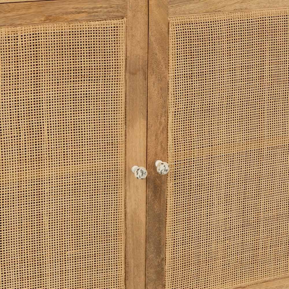 Le Aparador de ratán El aparador Rattan, fabricado en madera maciza de mango, destaca por su robustez y su diseño refinado. Su acabado en ratán natural añade un toque de elegancia artesanal, lo que convierte a este mueble funcional y a la vez estético en una pieza imprescindible para realzar su interior con autenticidad y encanto.