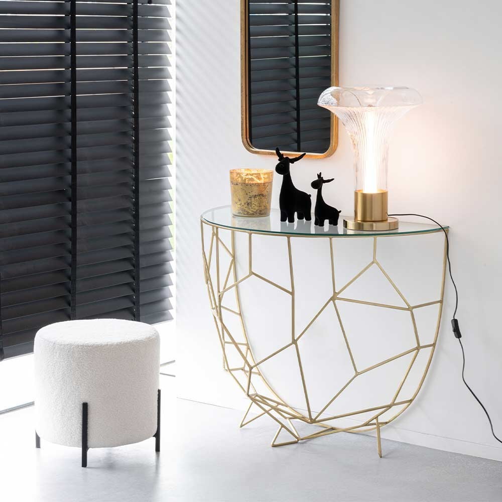 La consola Monzacon su estructura de metal dorado y su tapa de cristal, combina elegancia y minimalismo. Su diseño elegante y chic combina armoniosamente con cualquier decoración, añadiendo un toque de refinamiento a su hogar.