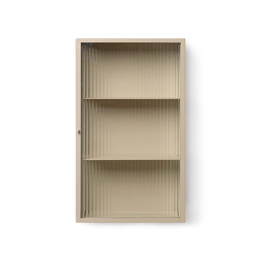 Este armario de pared beige Haze de Ferm Living te permite guardar todo lo que quieras en el interior: tus ollas en la cocina, tus bellezas esenciales en el baño o tus llaves y gafas de sol en el pasillo. Hecho de acero pintado en polvo y equipado con elegantes paneles de vidrio de caña y una puerta, este armario de pared encajará perfectamente en su interior.