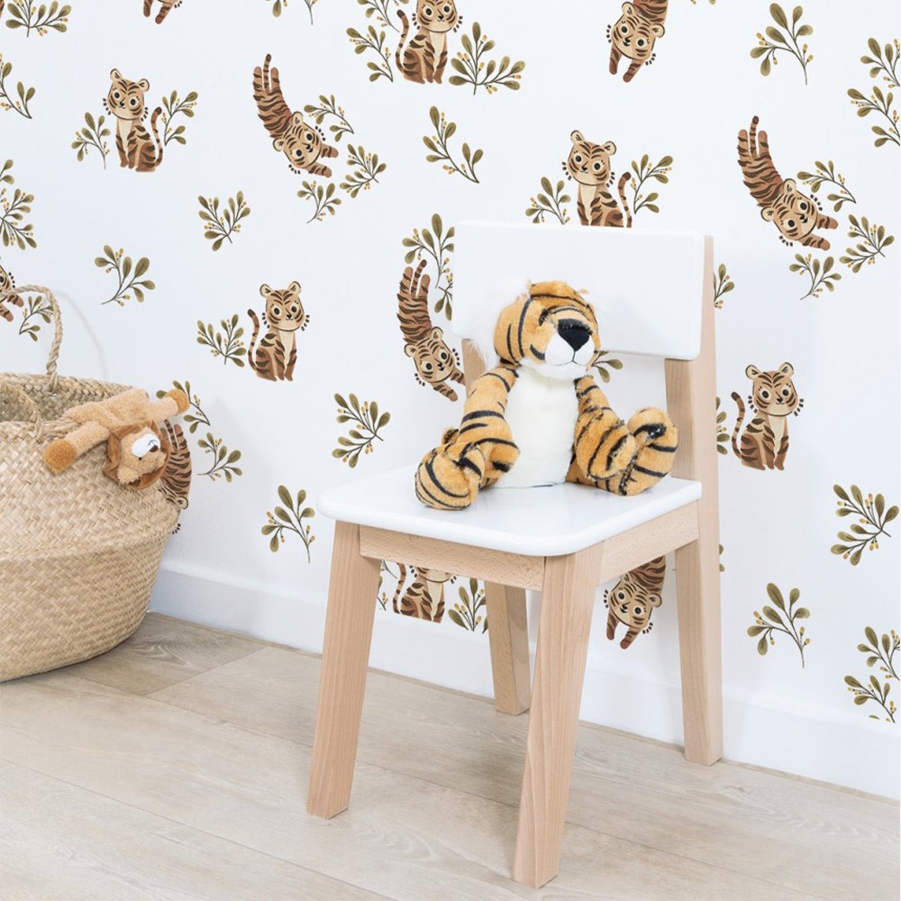 Descubra este magnífico papel pintado de la colección Felidae realizado en papel no tejido con pequeños tigres como motivo para personalizar el dormitorio de su hijo. El papel no tejido es un material que ha revolucionado el mundo del papel pintado, fácil de colocar, no necesita mesa para empapelar, la cola se aplica directamente sobre la pared y no requiere ninguna preparación especial y se puede cortar fácilmente con un cúter.