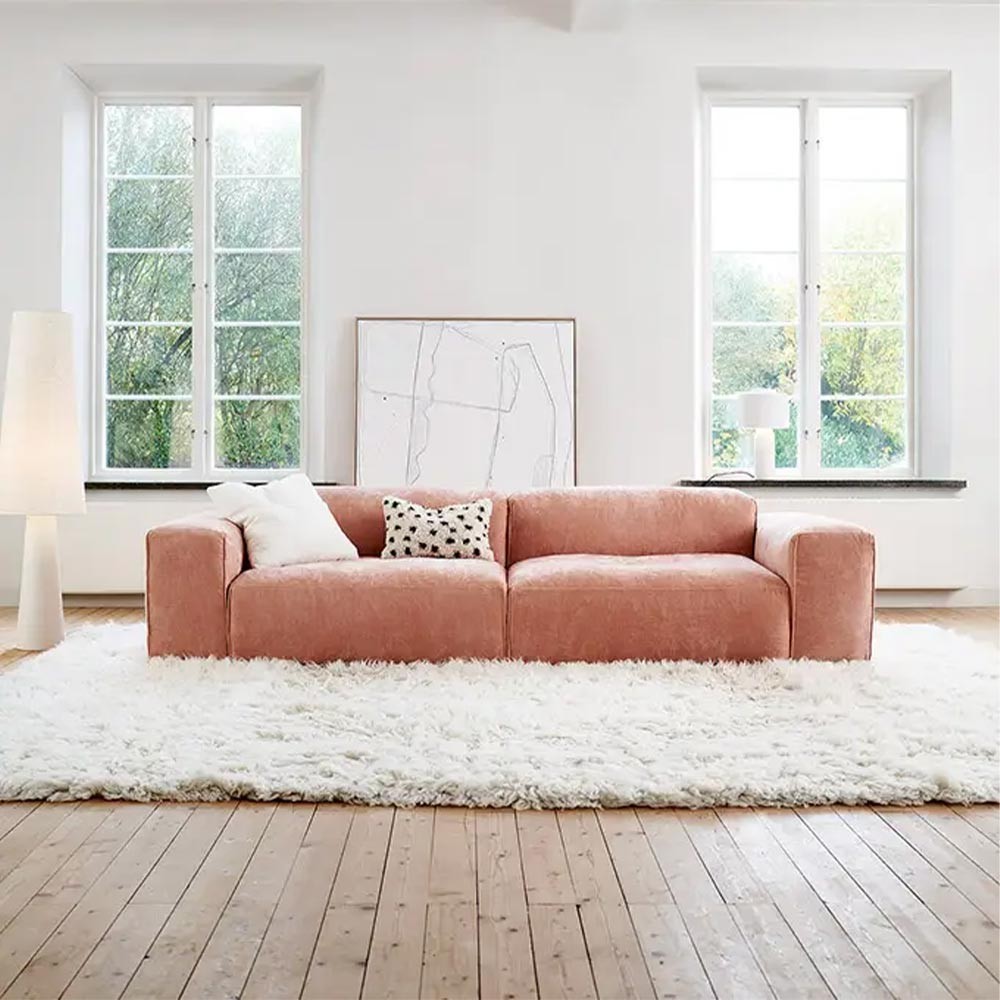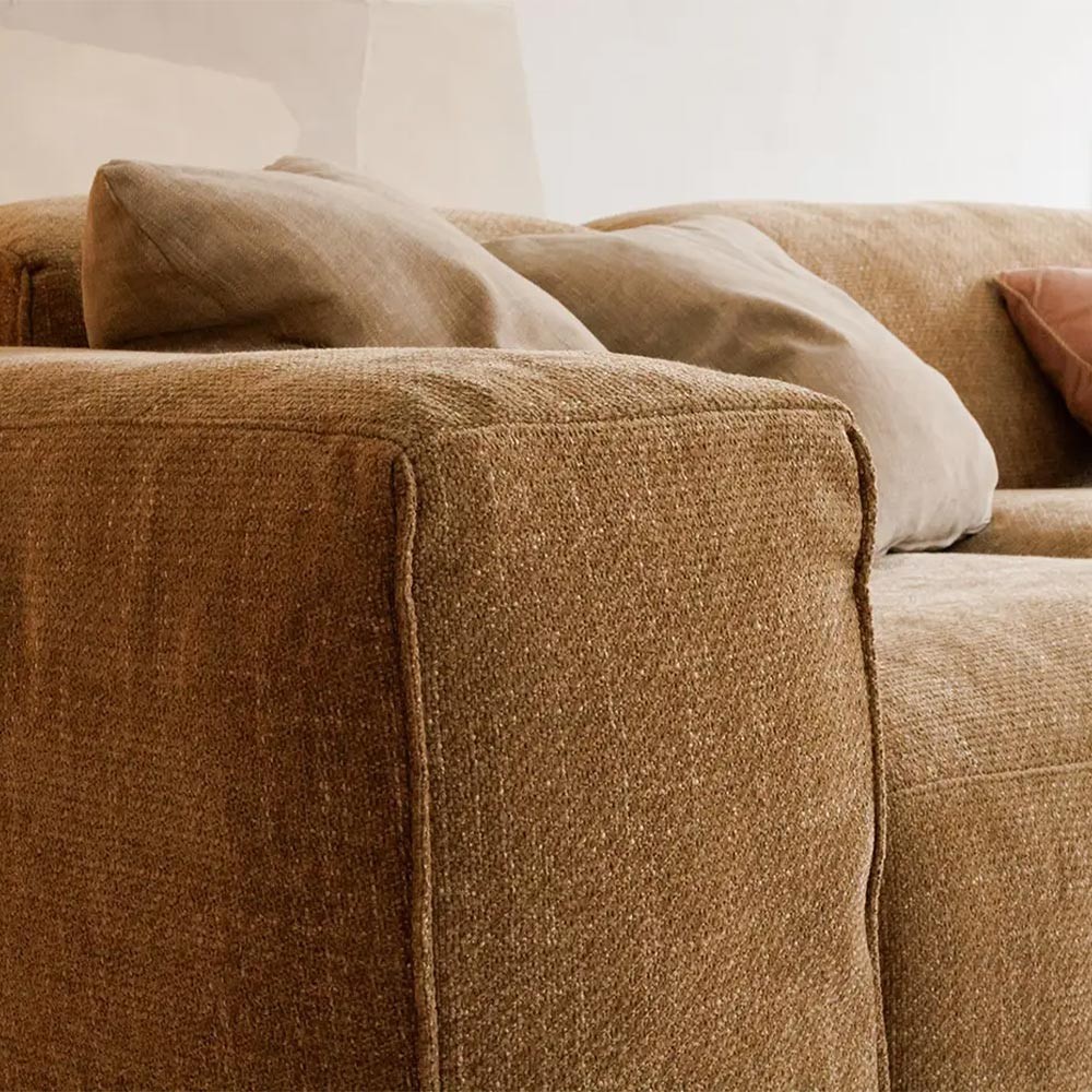 Este sofá de diseño se distingue por sus elementos ligeramente acolchados, que ofrecen un excelente equilibrio entre soporte y comodidad. Los amplios asientos invitan a la relajación, mientras que los suaves respaldos proporcionan una sensación envolvente ideal para momentos de descanso. Cada módulo cuenta con fundas extraíbles con cierre de velcro, lo que facilita la limpieza diaria y permite renovar su aspecto fácilmente.