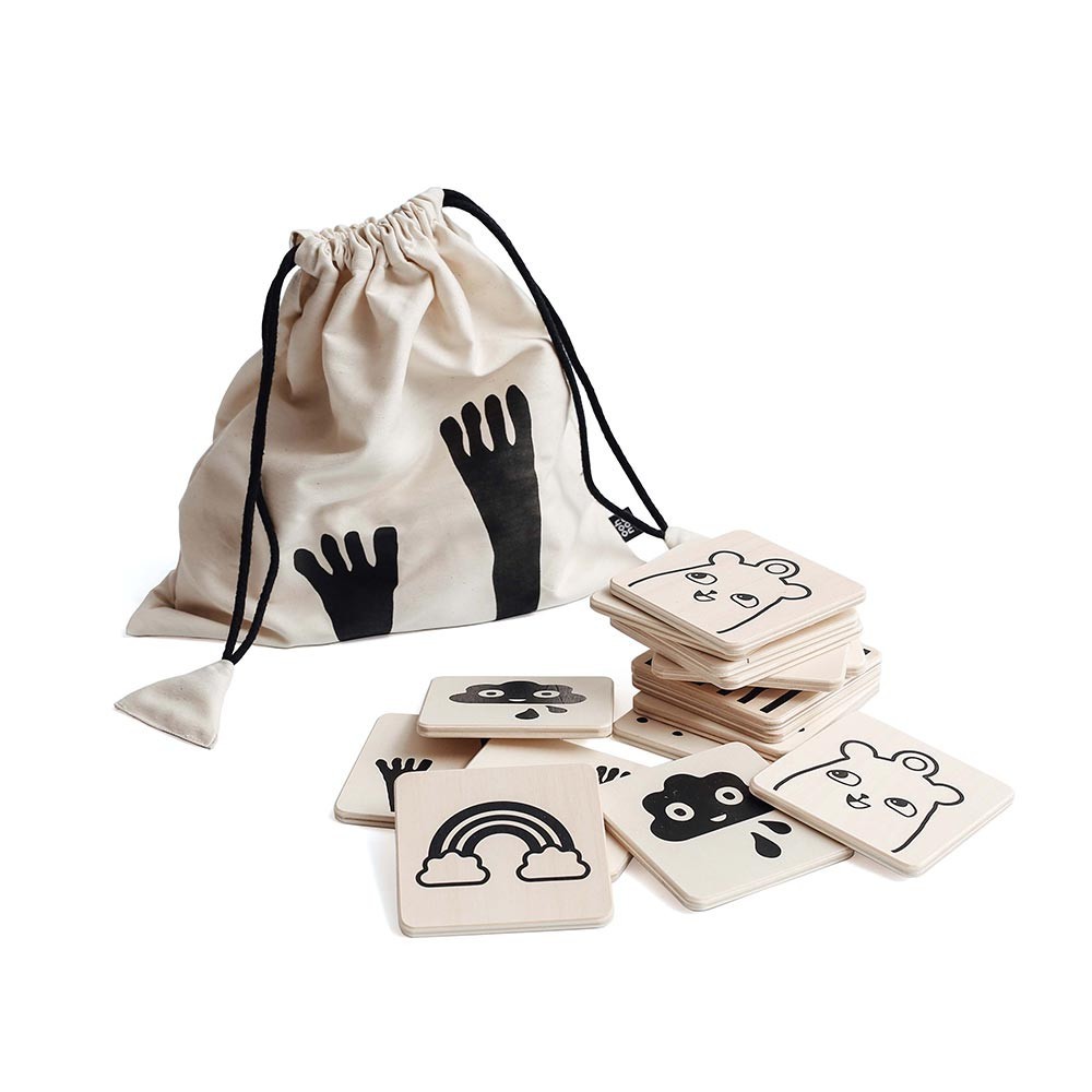 Vuelve a la infancia con este juego de memoria antiguo que contiene 8 pares de ilustraciones. Tu hijo podrá manejarlos fácilmente gracias a sus grandes tarjetas de madera. Entregado en su pequeña bolsa de algodón, este juego de memoria te seguirá a todas partes y mantendrá a tu pequeño ocupado en todas las circunstancias.