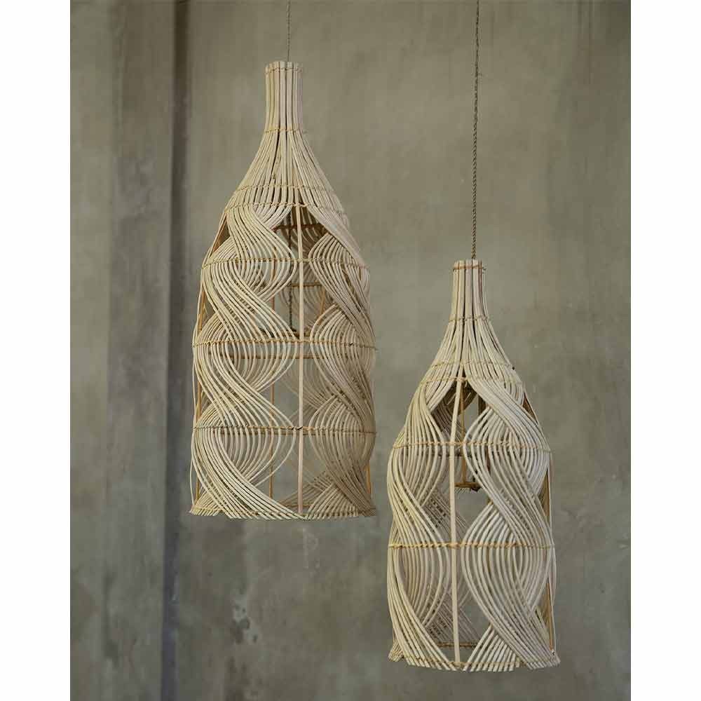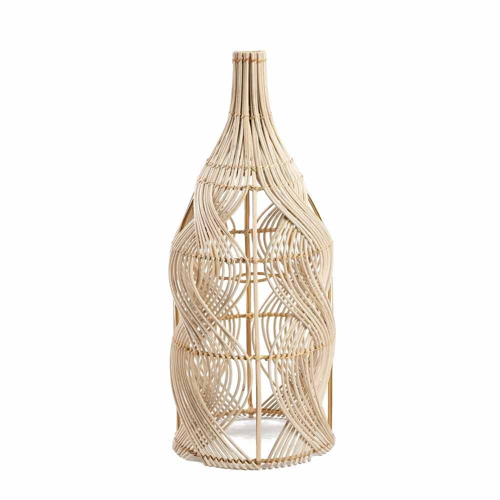 Esta bonita lámpara puede utilizarse como lámpara colgante, de pie o incluso de sobremesa. Está hecha de ratán, con un magnífico patrón que se estrecha hacia la parte superior, formando la forma de una botella.