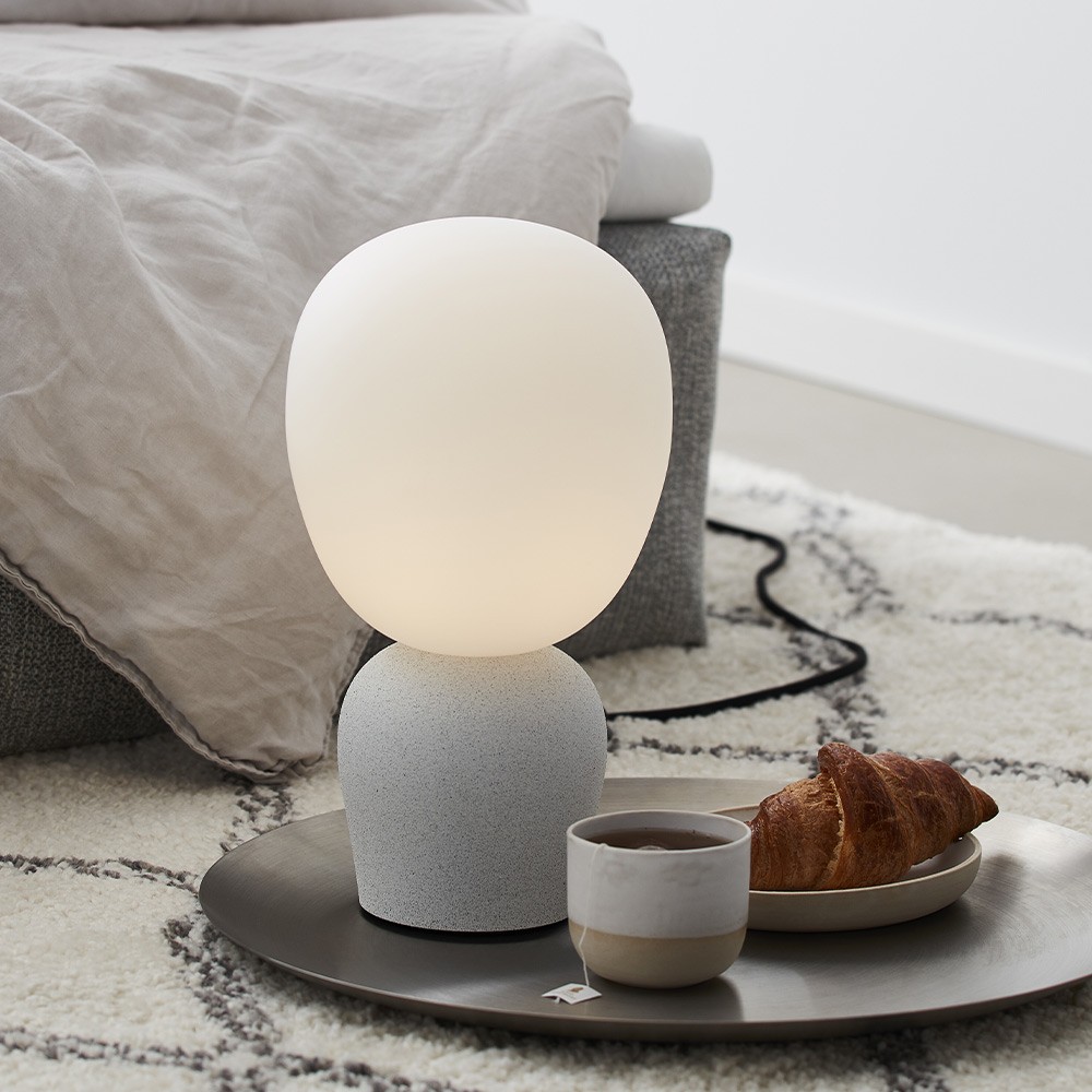 Descubra la hermosa lámpara de mesa Buddy, de formas suaves. Su diseño la hace adecuada para cualquier interior. Colocada en el centro de una mesa, sobre una cómoda o incluso como lámpara de mesilla de noche, aportará luz a través del cristal blanco opalino de la luminaria sin deslumbrar.
