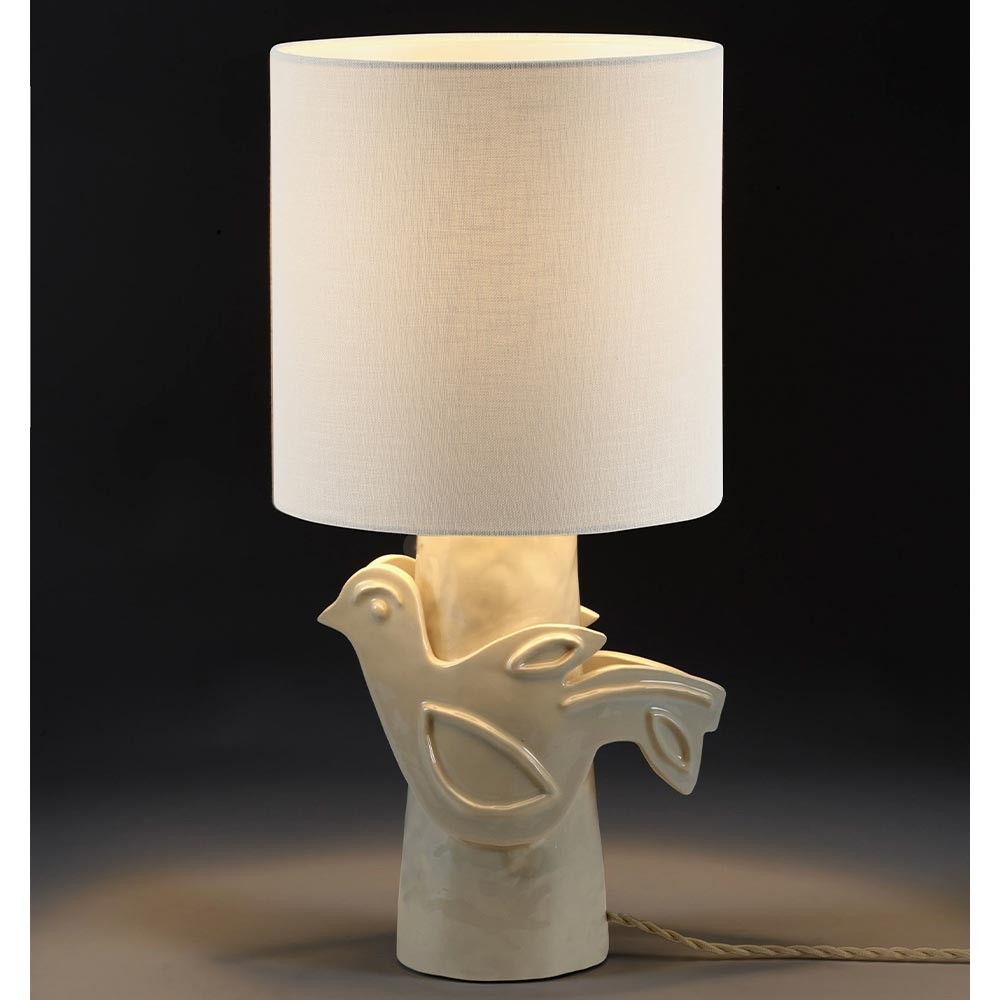 La lámpara de ambiente Paloma, de estilo clásico, presenta una llamativa base con una pantalla de lino neutro. Adornada con una paloma modelada a mano, la lámpara evoca los bocetos de Picasso y rinde homenaje a la hija del pintor, Paloma. Se utilizan los tres colores elegidos por Marie para la cerámica: marrón oscuro, rojo cálido y el color natural de la arcilla con un esmalte incoloro. El cordón, envuelto en tela retorcida negra o blanca, añade un toque elegante a la lámpara.