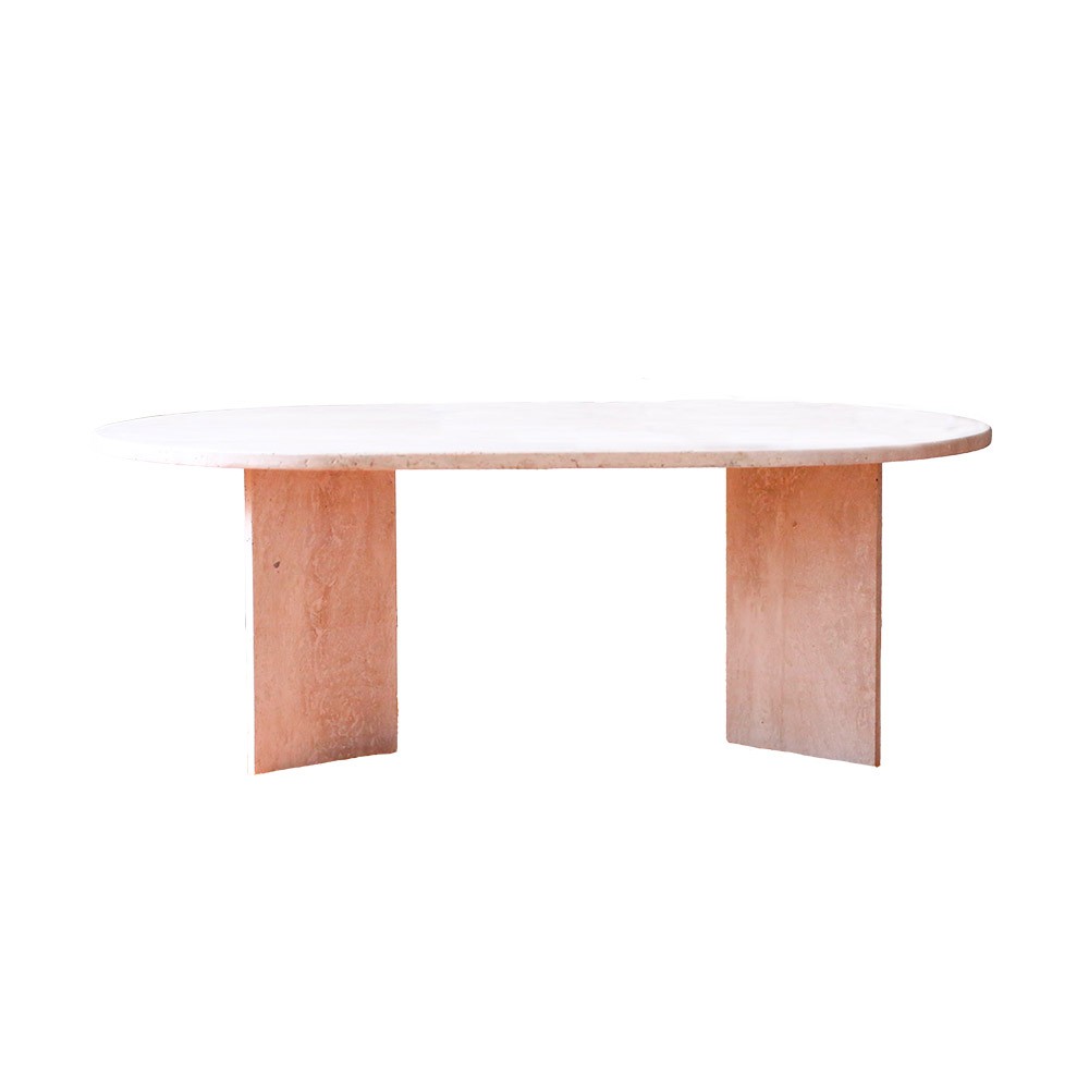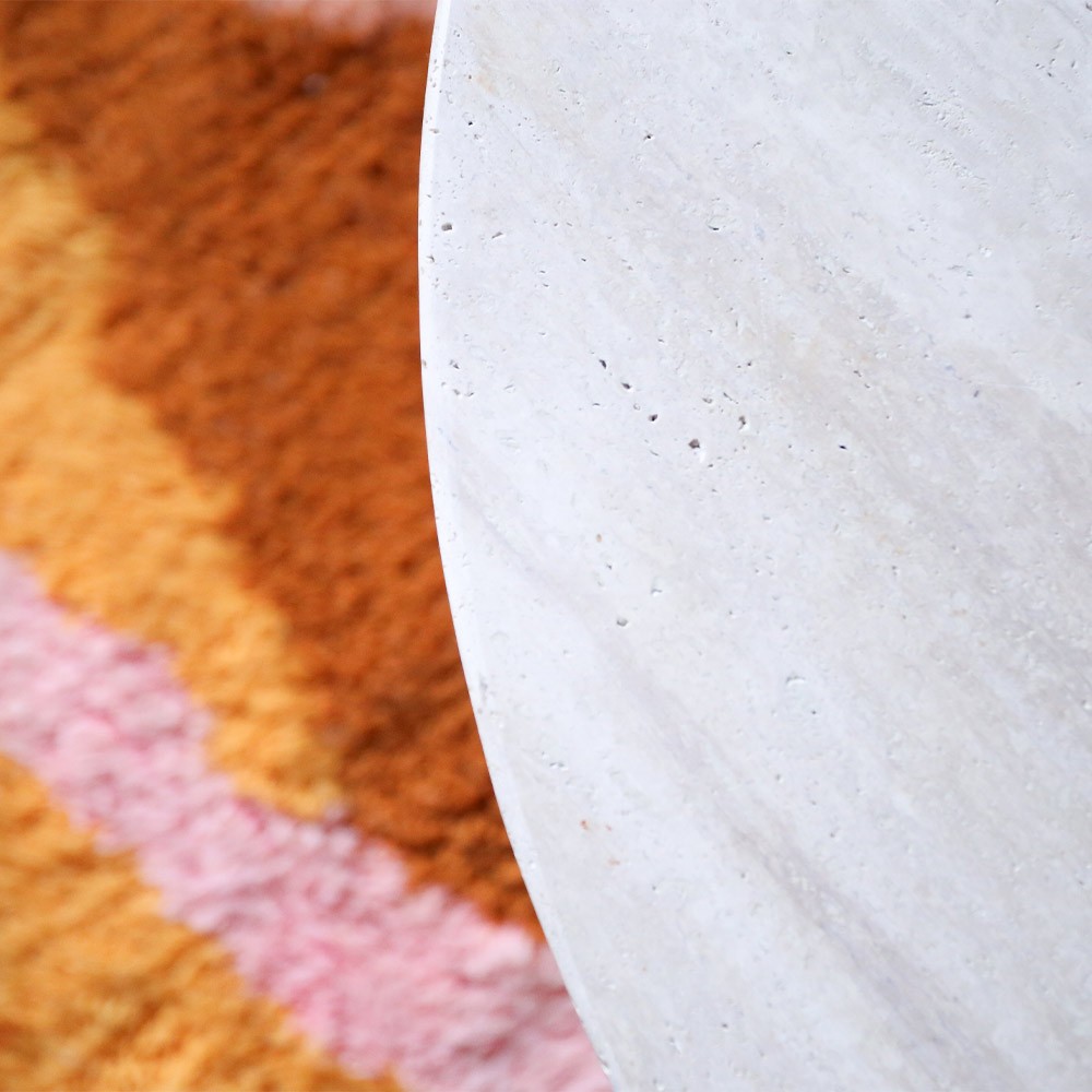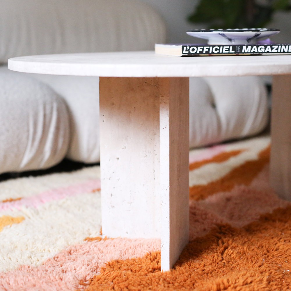 Mesa de centro de travertino diseñada por la fundadora de THEM, Marion, y fabricada 100% a mano en Marruecos en uno de nuestros talentosos talleres asociados.