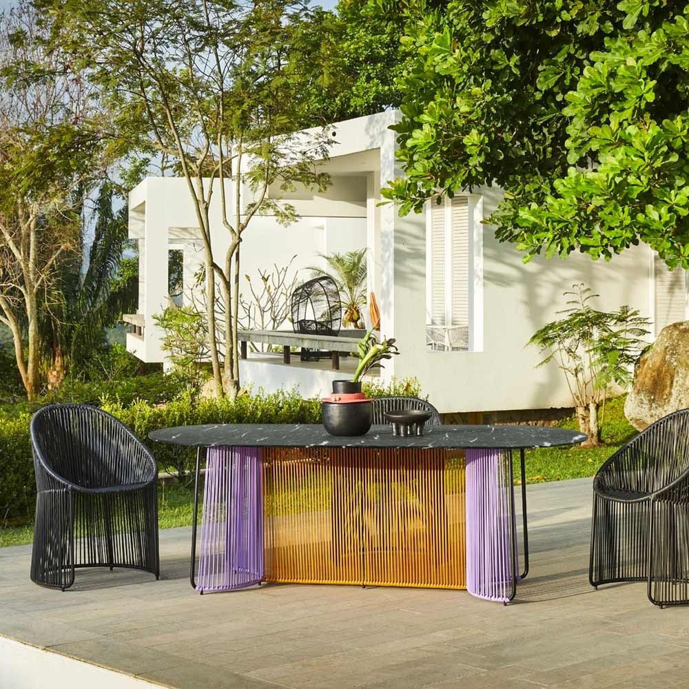 - Estructura: acero con recubrimiento de polvo | Cuerdas: Plástico reciclado PVC | Tapa: mármol