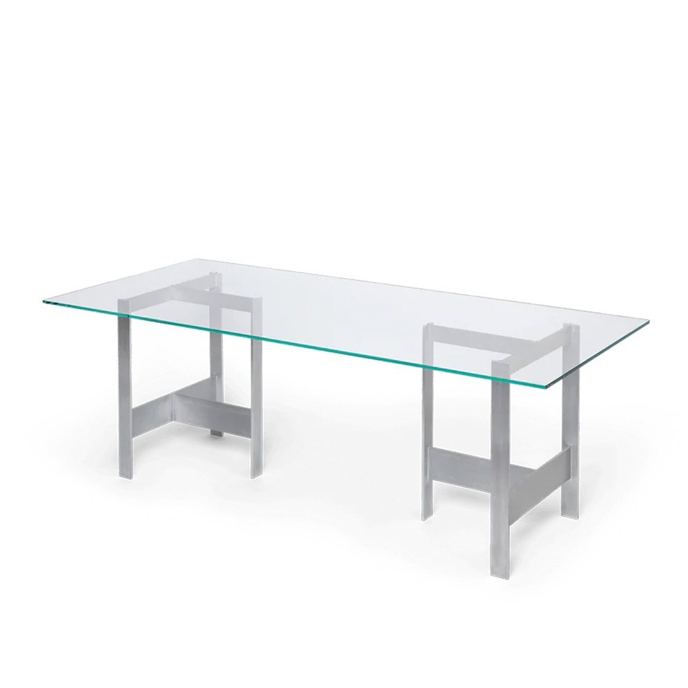 Llamada así por la palabra danesa que significa "almacén", la mesa de comedor Lager rinde homenaje a las formas utilitarias clásicas. Fabricada en aluminio, la mesa encarna una estética limpia y contemporánea que recuerda los principios del diseño Brutalista. Con un acabado satinado en bruto, las patas de aluminio realzan su forma limpia y angulosa a la vez que proporcionan un soporte resistente. La elegante tapa de cristal contrasta sutilmente con su base, ofreciendo versatilidad para servir a una gran variedad de espacios y ocasiones. El diseño versátil de la mesa la hace adecuada para cocinas, comedores y oficinas.