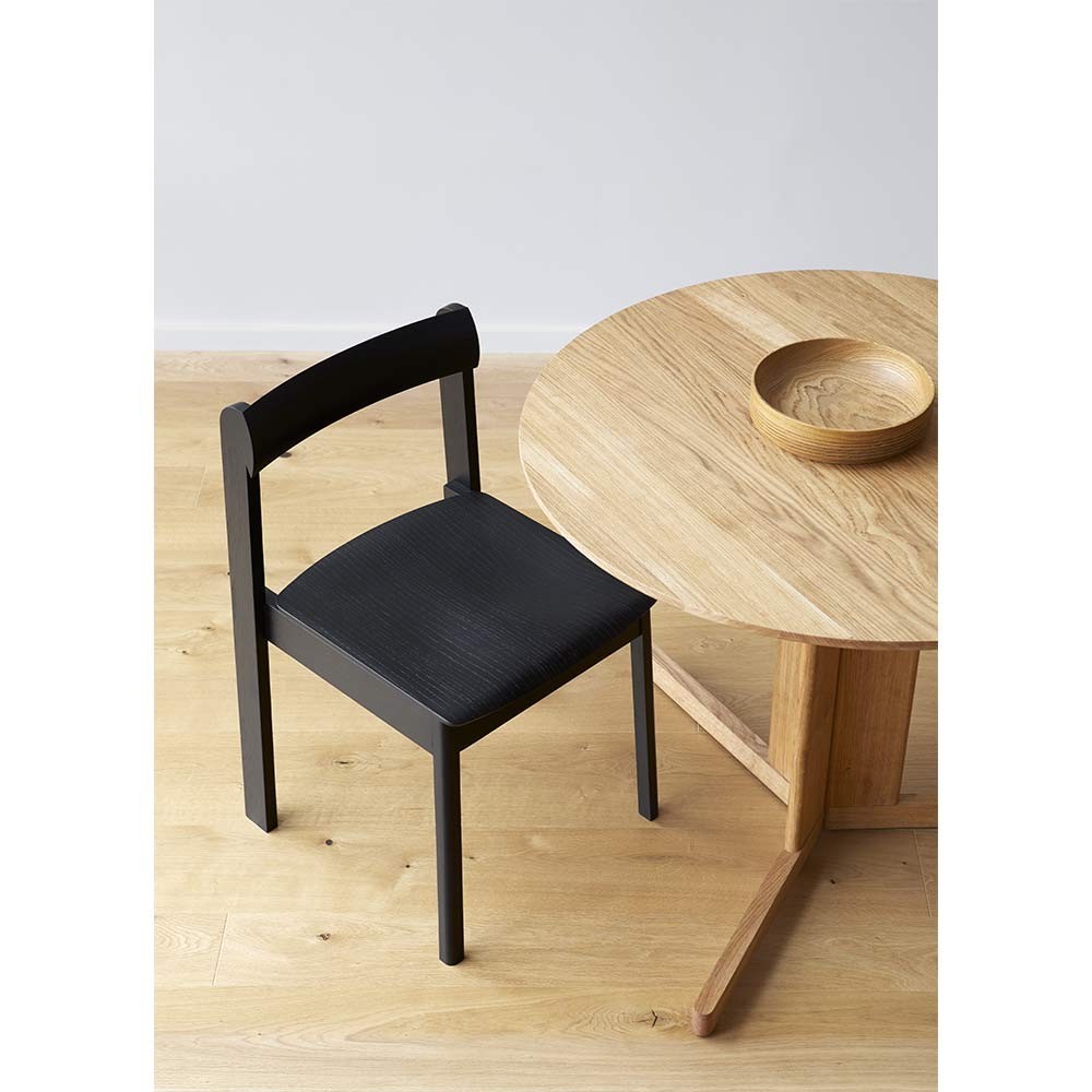 Un punto central formado por elementos flotantes de roble macizo sostiene la mesa redonda, creando una contradicción entre ligereza y consistencia.