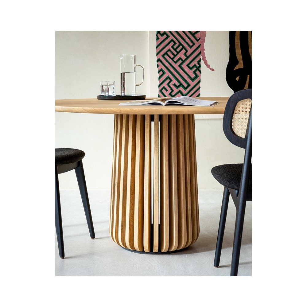 Maru es una mesa de comedor ovalada de roble con una base de listones hecha a mano. La interacción entre el tablero liso de roble macizo y la estructura abierta de la base crea una estética sencilla pero contundente para la mesa. Mientras que el uso de un único material aporta tranquilidad, el diseño minimalista de Maru le confiere un atractivo atemporal y llamativo, haciendo de esta mesa un complemento excepcional para cualquier comedor.