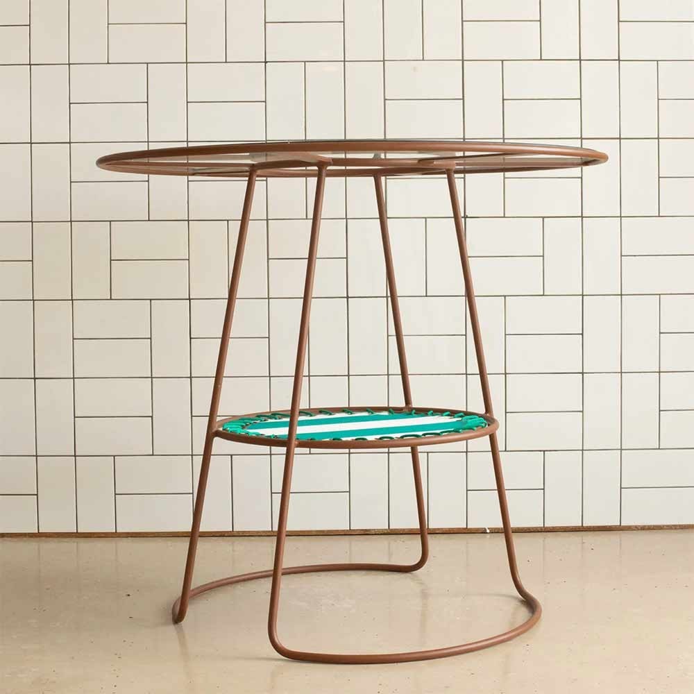 La mesa se compone de un armazón de hierro pintado en epoxi, un tablero de cristal de seguridad y un tablero intermedio de tela para exteriores delicadamente encajado en el conjunto de la estructura. El sobre de tela retoma los motivos de la silla Palmer y sus lámparas colgantes homónimas.