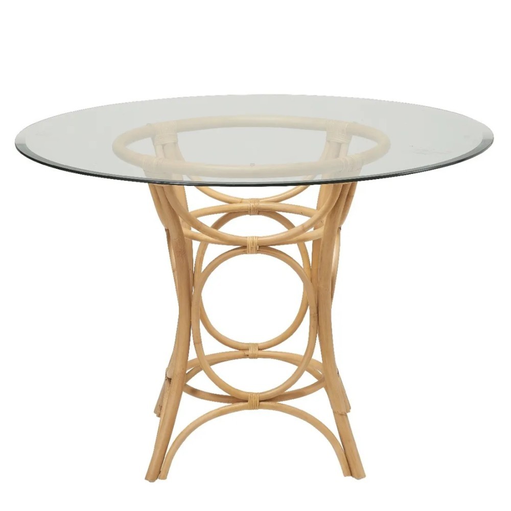La mesa redonda Gingko de ratán, aquí representada con un tablero de cristal de 110 cm de diámetro (ideal para 4 ó 5 comensales), retoma con autenticidad los códigos gráficos tradicionales de los muebles de mimbre: arcos que se refuerzan, ligaduras generosas y el grano bruto de la fibra natural.
