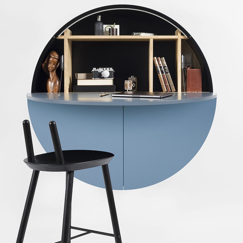 El escritorio de pared Pill azul y negro, diseñado para EMKO, se adhiere a la pared y se transforma instantáneamente en un lugar de trabajo funcional, un cambiador o incluso una barra. El sistema de estanterías en el interior está diseñado para permitir al usuario cambiarlo y adaptarlo fácilmente: puede contener un portátil, archivos y catálogos, libros o cualquier otro elemento personal. Además, Pill está equipado con enchufes y la opción de integrar luces LED. Los materiales y accesorios utilizados en la fabricación garantizan una perfecta robustez en la oficina. Pill se adapta perfectamente a cualquier tipo de interior, permitiéndote tener un espacio oculto para tus artículos.