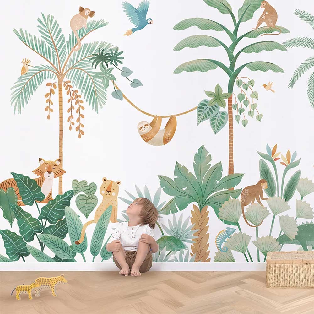 Este papel pintado selvático panorámico Yatsuni te transporta al corazón de la jungla, con sus animales exóticos y sus cautivadores detalles artísticos. Perfecto para los niños amantes de la naturaleza, esta decoración transforma su dormitorio en un lugar de aventuras y sueños. El papel pintado no tejido es fácil de colocar y proporciona un acabado liso en la pared, apto para todas las superficies.