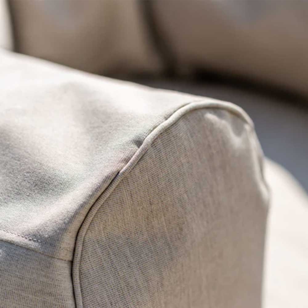Fabricado con Sunbrella Plus®, un tejido de alta gama para exteriores resistente al agua, los rayos UV, las manchas y la decoloración, este conjunto está diseñado para permanecer en el exterior todo el año, ideal incluso cuando el espacio de almacenamiento es limitado.