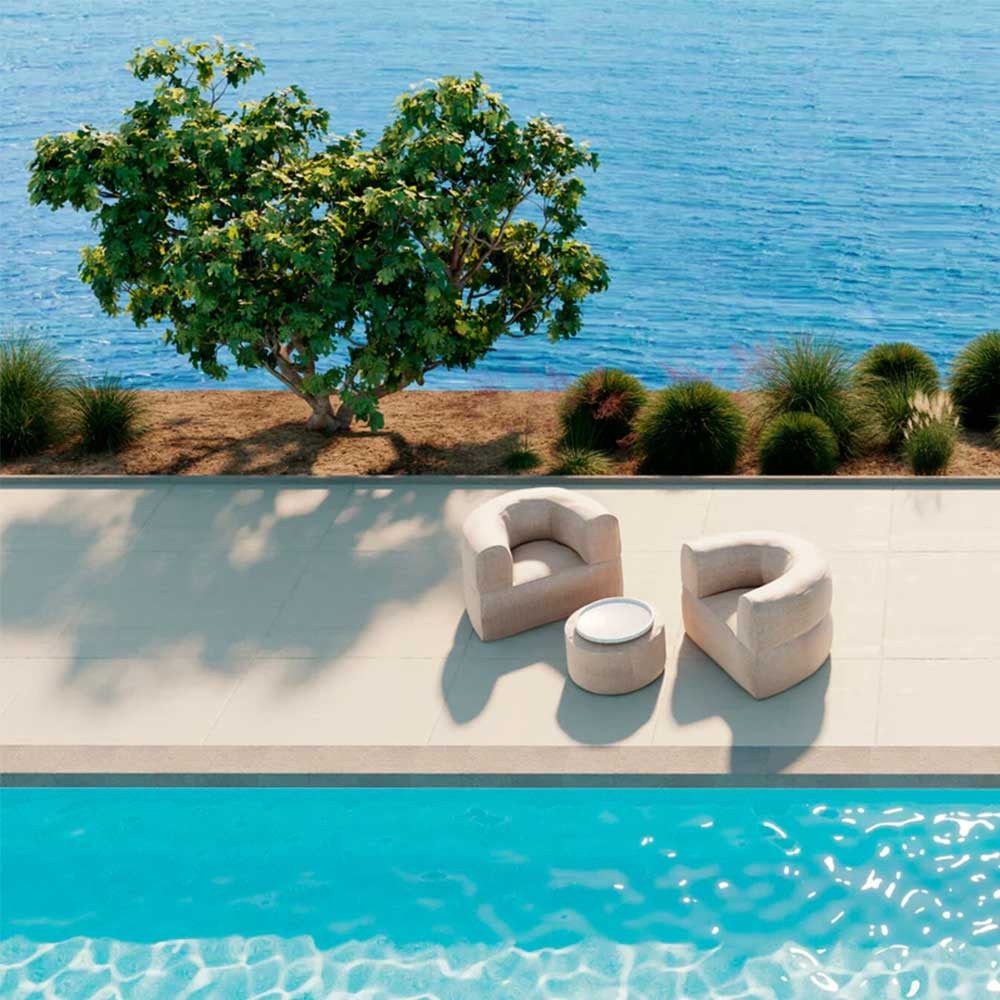 Un refinado salón de exterior diseñado para una tranquila conversación entre dos personas.
