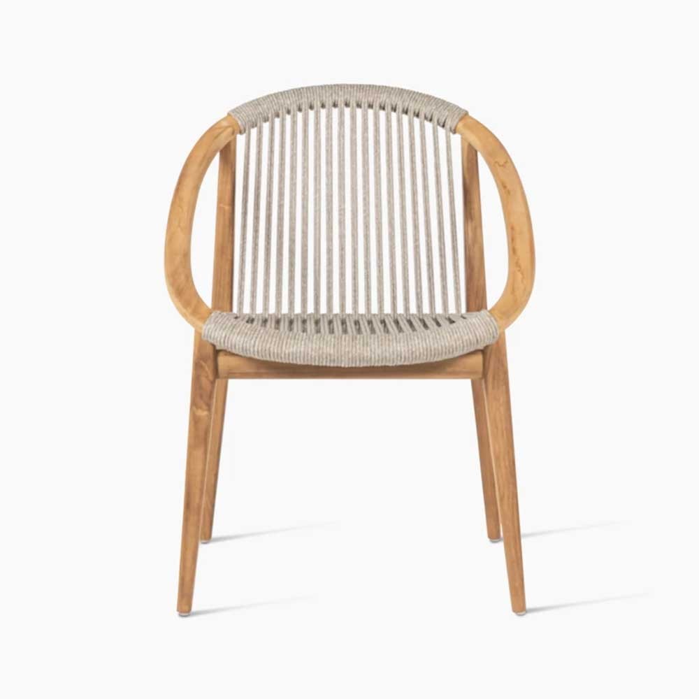 La silla de comedor Frida retoma la silueta icónica del modelo original, combinando ligereza, tacto agradable y estética escandinava. Su armazón redondeado descansa sobre robustas patas de teca, mientras que su asiento de cuerda tensada ofrece un refinado confort.