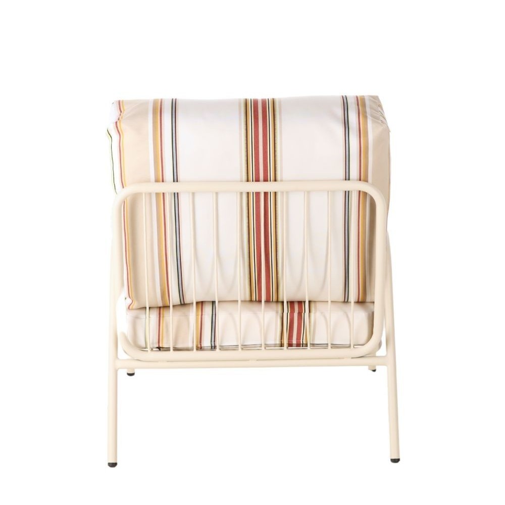 Dé a sus momentos al aire libre un toque de confort y elegancia con el sillón de jardín AZZURO AUGUSTE de Athezza. Este sillón te conquistará por su aspecto veraniego y su estructura metálica ligera y resistente. Los cojines están generosamente tapizados con rayas multicolores (ocre, rojo, negro y beige) sobre un fondo crudo, evocando un aire soleado y retro. Perfecto para una terraza, un balcón o un jardín, este sillón combina estilo y practicidad gracias a sus materiales diseñados para resistir el uso en el exterior. Una pieza simpática y gráfica que invita a relajarse.