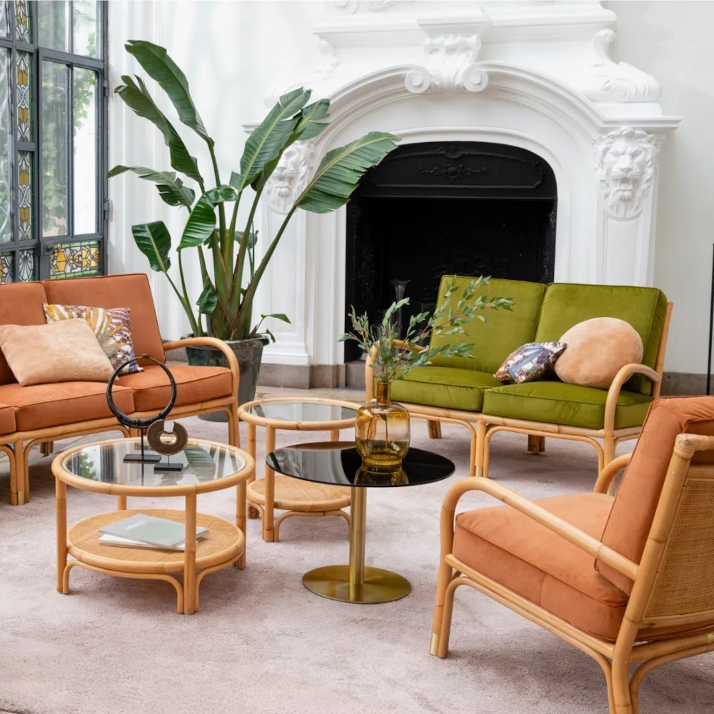 Inspirada en las líneas emblemáticas del ratán de los años 70 y 80, la colección Riviera de ratán natural retoma los códigos gráficos con elegancia: curvas puras, diámetros generosos de ratán, dimensiones compactas y acabados cuidados.