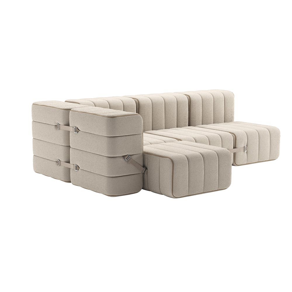 El conjunto de 9 módulos Curt puede sostenerse por sí solo y convertirse en un sillón asimétrico, un banco, un sillón o pequeños taburetes individuales. Unos pocos módulos individuales son suficientes para transformarse en un sistema de sofá modular y extremadamente flexible y eso de una manera muy sencilla: El conjunto de 9 módulos Curt consta de correas ajustables que te permiten crear sin fin.
