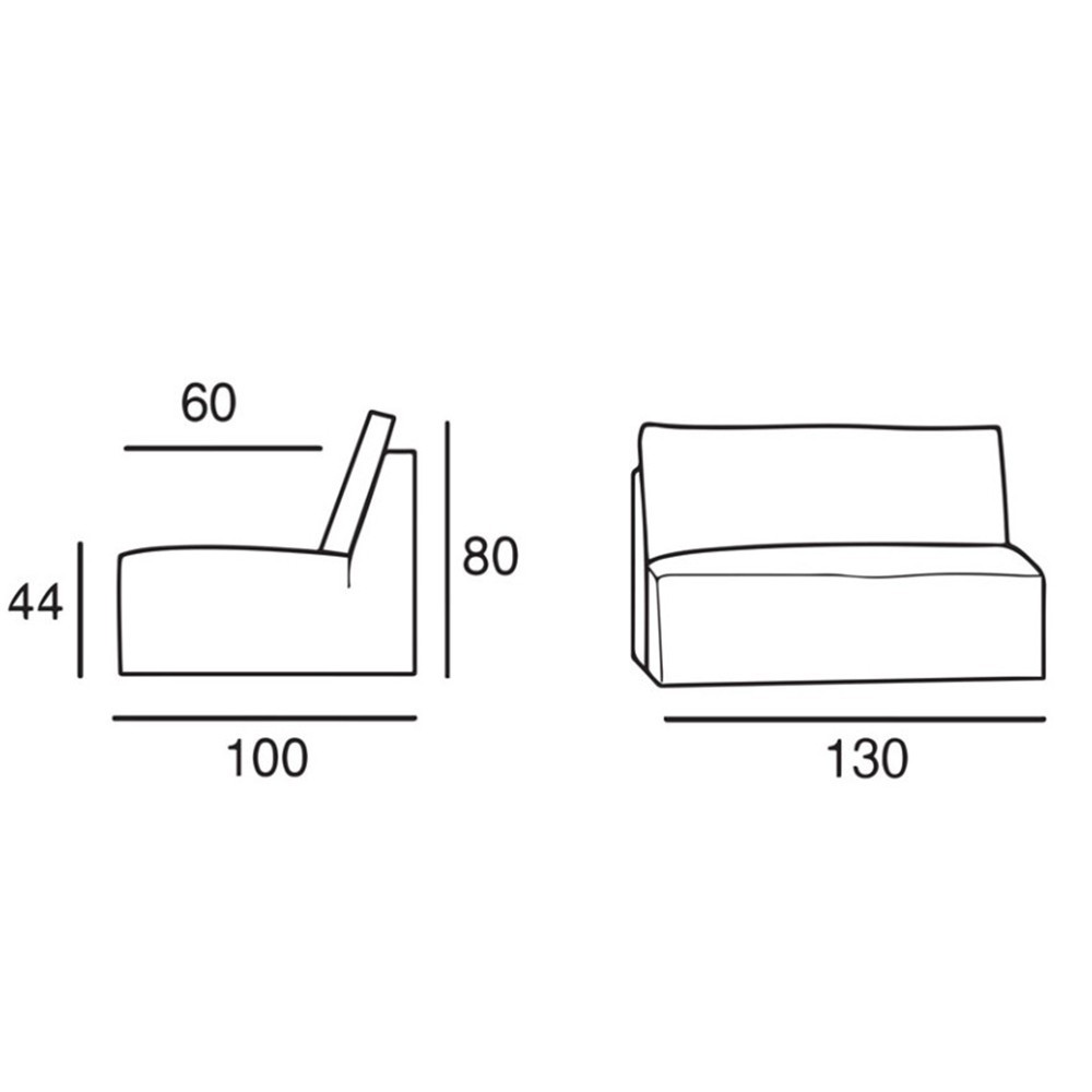 - Largeur : 130 cm | Profondeur : 100 cm | Hauteur : 80 cm | Profondeur d’assise : 60 cm | Hauteur d’assise : 44 cm