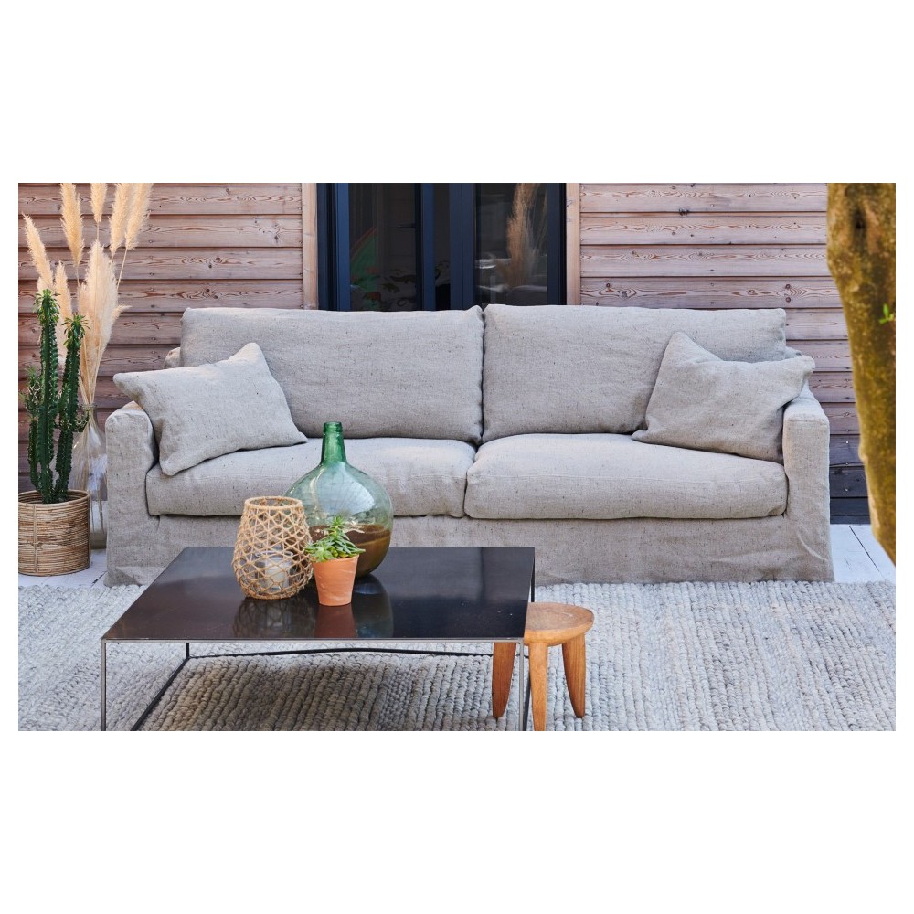 Descubra el sofá de lino Biscarrosse, que mezcla el estilo bohemio chic con un aspecto de diseño inmejorable. Le encantará acurrucarse en sus grandes cojines de plumas que garantizan un confort óptimo. Este sofá, fabricado íntegramente en Francia, aportará un toque marino a su hogar. Combina perfectamente con materiales naturales como la madera y el yute. El sofá Biscarrosse está disponible en varios acabados de tela: natural, guijarro, blanco, verde oliva... seguro que encontrará el color que encaje perfectamente con su interior. Este sofá también puede ser convertible (opcional). Los cojines del asiento y del respaldo son extraíbles para facilitar su cuidado.