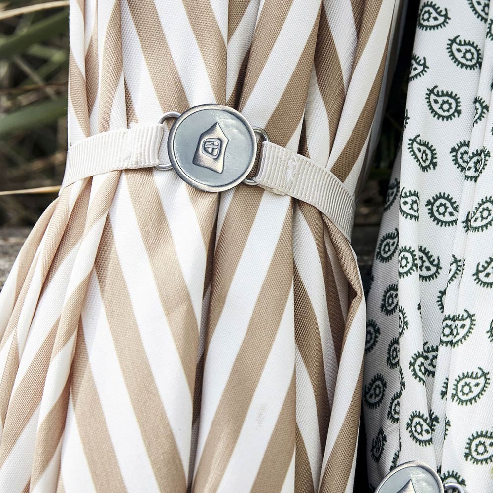 Con sus rayas blancas y de color arena y sus largos y gruesos flecos, la sombrilla Umbra de House Doctor confiere a su zona exterior un aspecto elegante con un innegable toque vintage. El mástil de madera es desmontable, por lo que podrá guardar fácilmente la sombrilla de jardín en la bolsa. Base no incluida. Diámetro del poste: 32 m