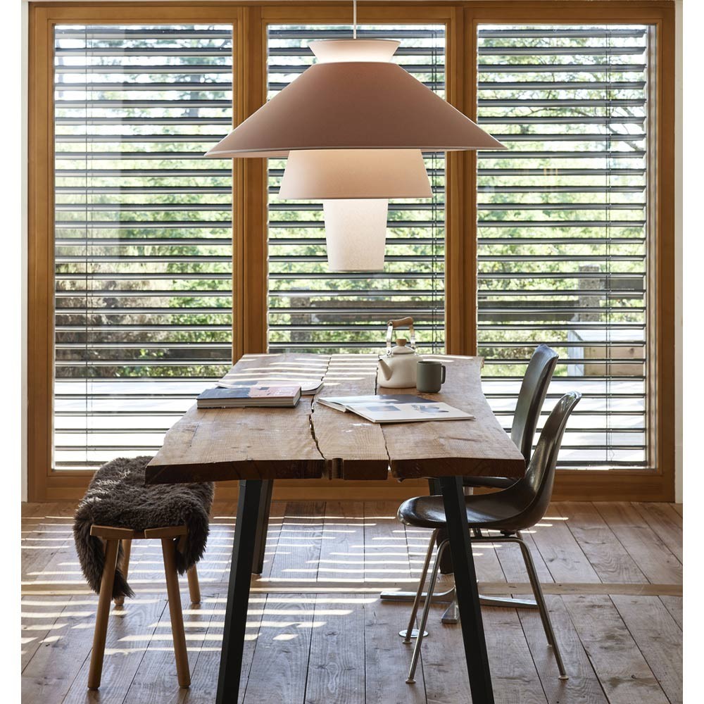 En un estilo de diseño con influencias escandinavas, esta acumulación de pantallas evoca la forma de una estilizada colmena. Los conos juegan con la luz, difundiéndola o reflejándola en la superficie lisa y suave de los materiales.