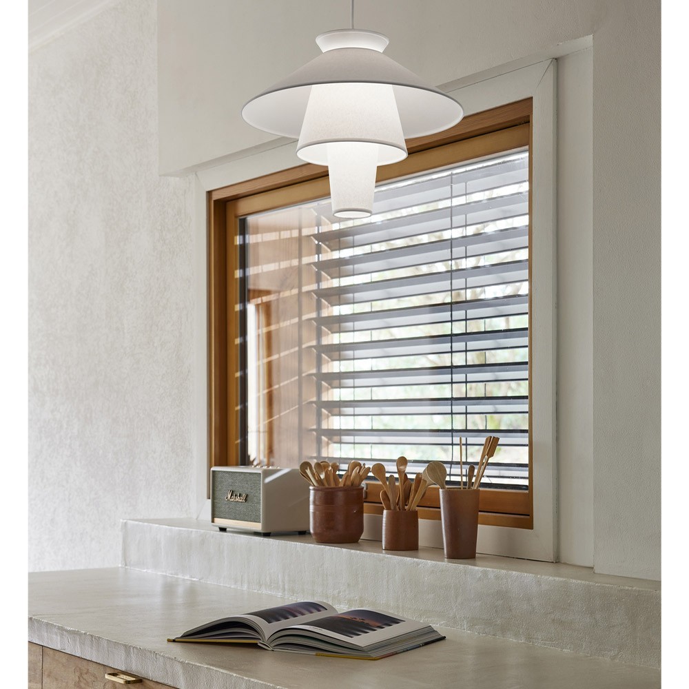 En un estilo de diseño con influencias escandinavas, esta acumulación de pantallas evoca la forma de una estilizada colmena. Los conos juegan con la luz, difundiéndola o reflejándola en la superficie lisa y suave de los materiales.