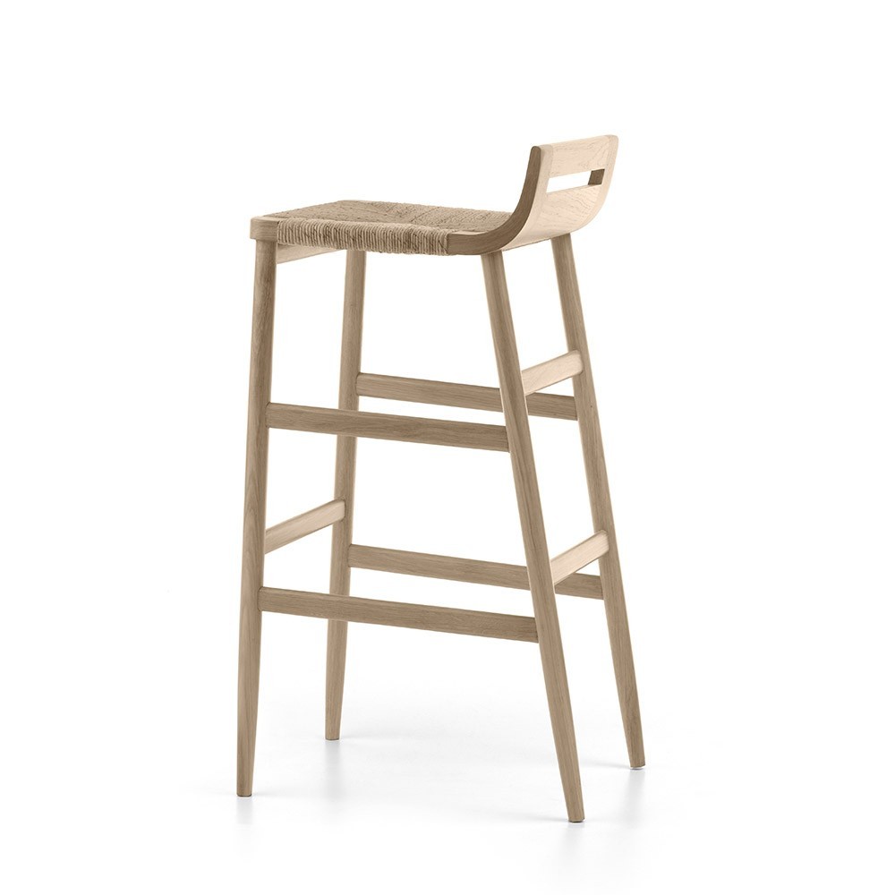 La silla de bar Kimua, de Alki, consta de una base y respaldo de roble macizo y un asiento de paja natural "tabouda" tejida a mano. Kimua fue diseñado para recordar muebles antiguos y se destaca como una colección atemporal que promueve la atención al detalle y la calidad.