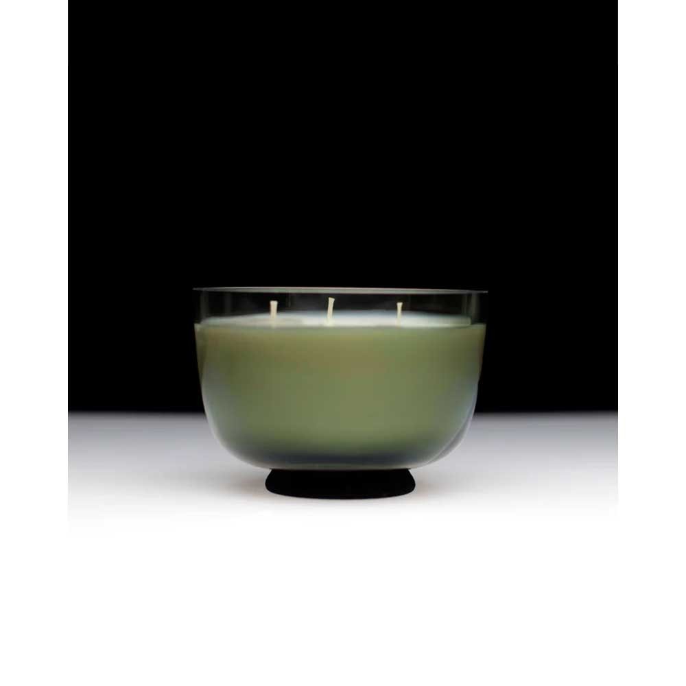 Fabricada en Grasse a partir de cera de soja natural, esta vela se vierte a mano y se enriquece con una mezcla exclusiva de aceites esenciales. Se presenta en vidrio coloreado soplado a boca, rematado con una base de corcho que le confiere un refinado efecto flotante. Objeto de diseño a la vez que fuente de fragancia, encarna un arte de vivir sobrio y profundo.
