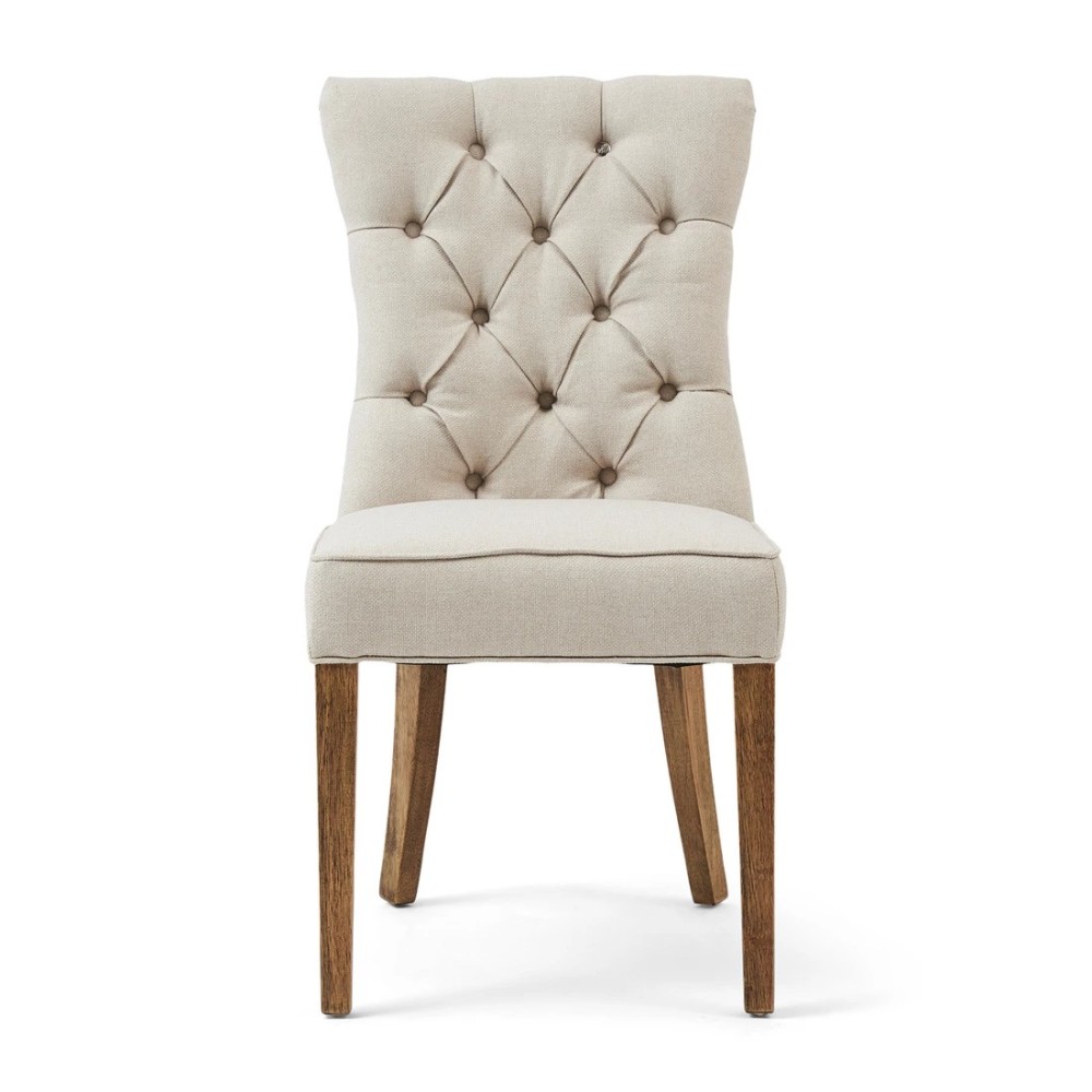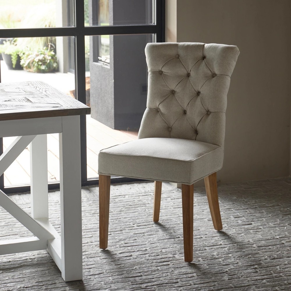 La chaise de salle à manger Balmoral est un modèle classique : assise et dossier droits, sans accoudoirs. Son assise est moelleuse et confortable, et son dossier capitonné lui confère une allure luxueuse. Le tissu léger Flanders Flax est à la fois résistant et durable. Cette chaise de salle à manger, aux tons naturels et clairs, repose sur quatre pieds en bois d'hévéa.
