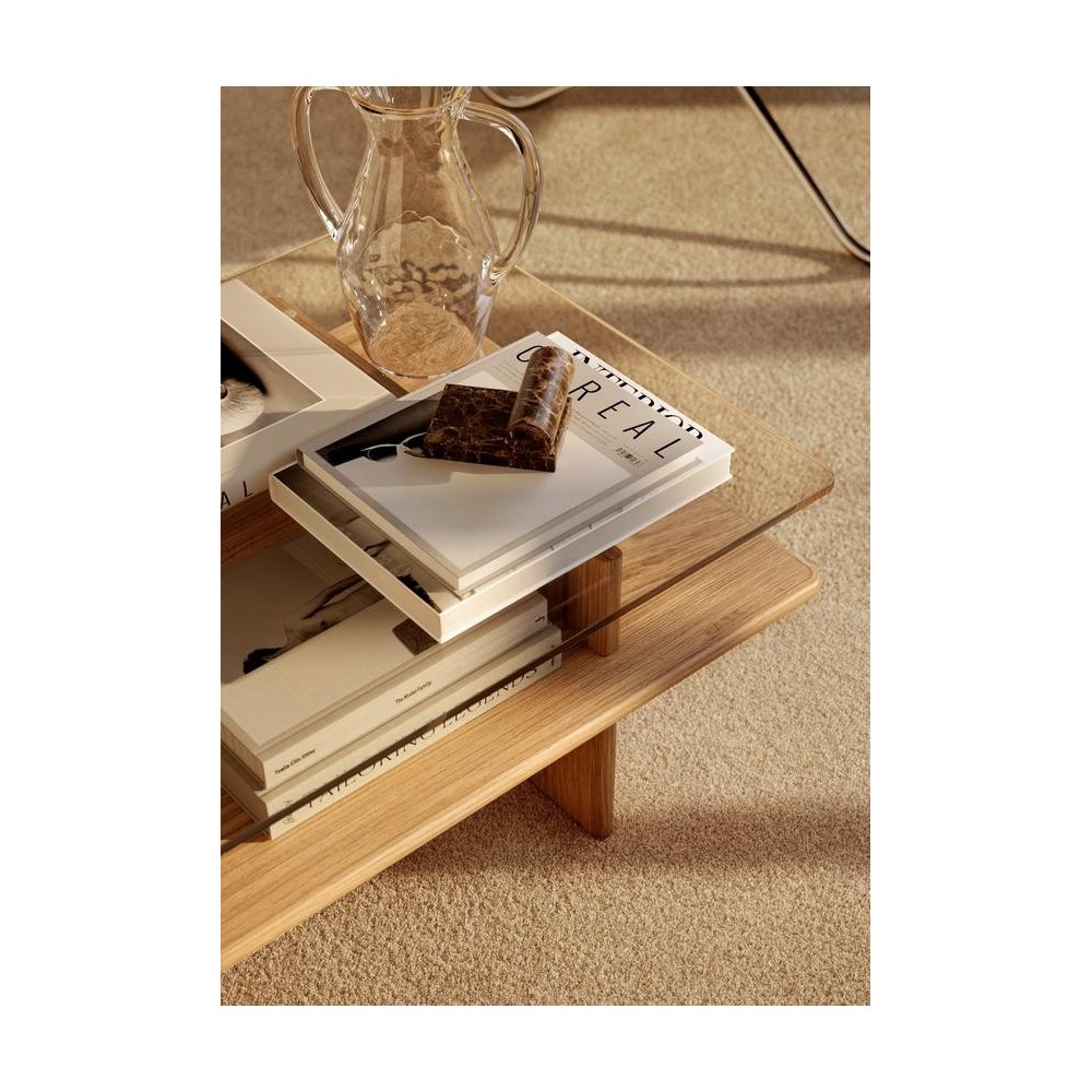 La table basse Parallel certifiée FSC ™ est iInspirée des vitrines des musées, la table basse Parallel joue avec l'intégration de galeries d'art dans la maison. Grâce au verre, l'espace entre les plans horizontaux devient un espace d'exposition esthétique pour les livres et les objets décoratifs du salon.